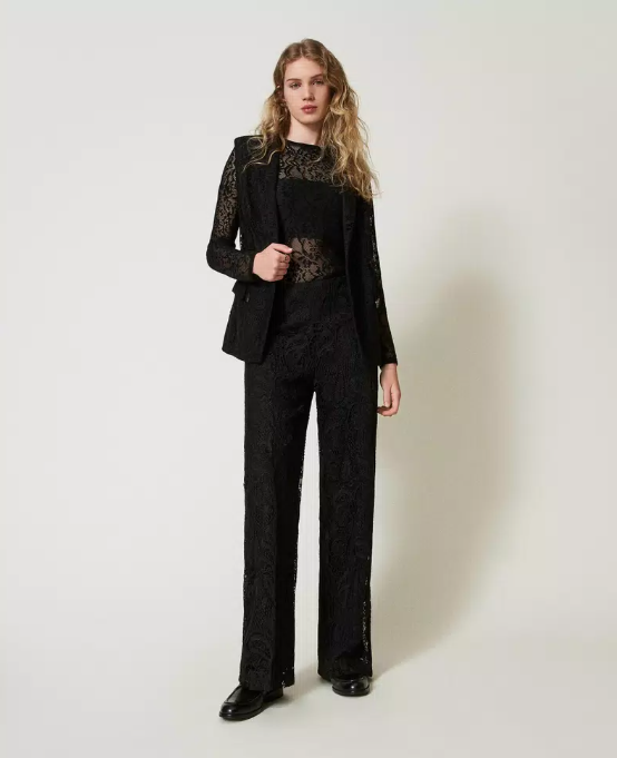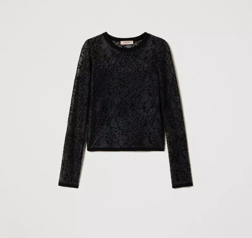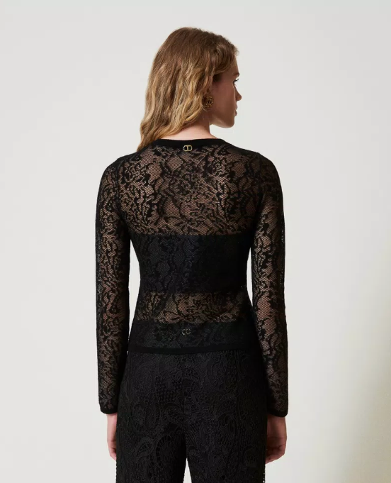 Sheer lace jacquard jumper — seductive structure and refined femininity.
