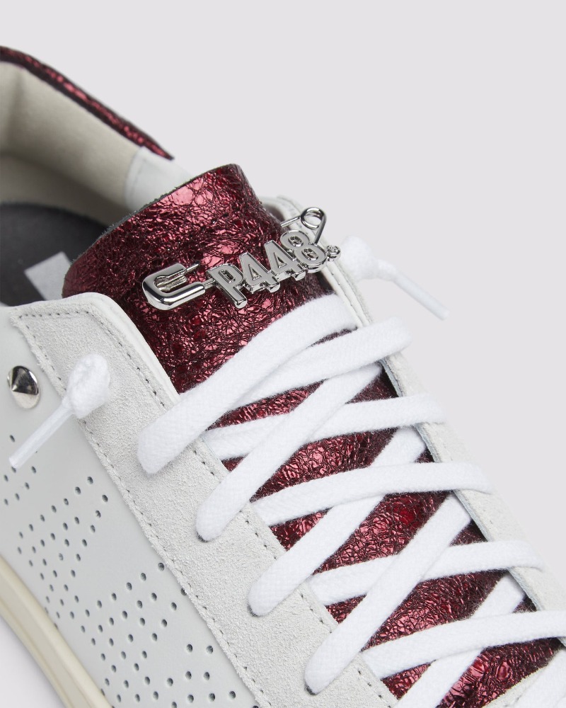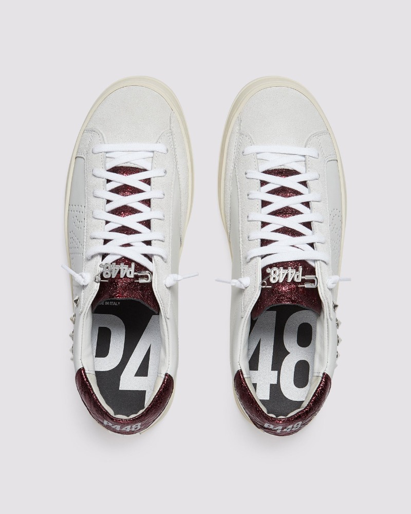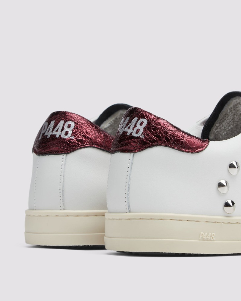 The P448 John Maroon/Stud is a low-top sneaker crafted in Italy, blending refined urban style with bold details. It features a white leather upper with the P448 perforated logo, off-white suede panels, and a metallic crackled maroon leather tongue and heel tab. Eye-catching metal stud accents and a hand-distressed rubber sole add a laid-back yet contemporary feel.