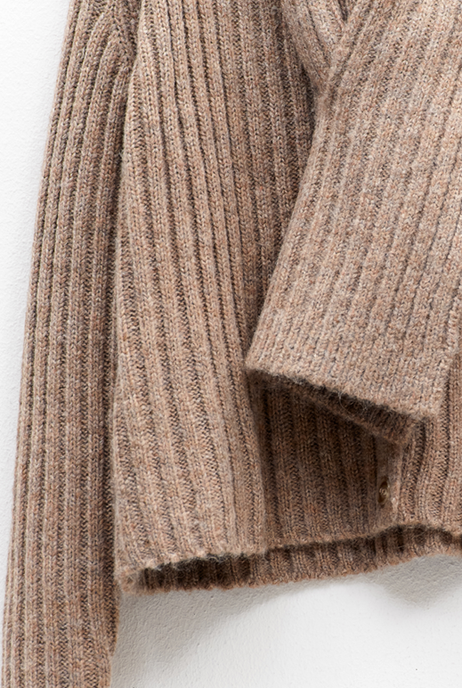 Casaco curto em malha canelada com gola cachecol integrada e textura envolvente. O design combina conforto e sofisticação, com uma silhueta levemente descontraída e acabamento em borda crua.