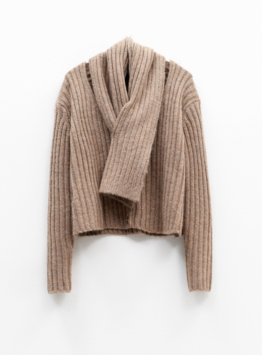 Short ribbed knit cardigan featuring an integrated scarf collar and soft raw-edge finish.