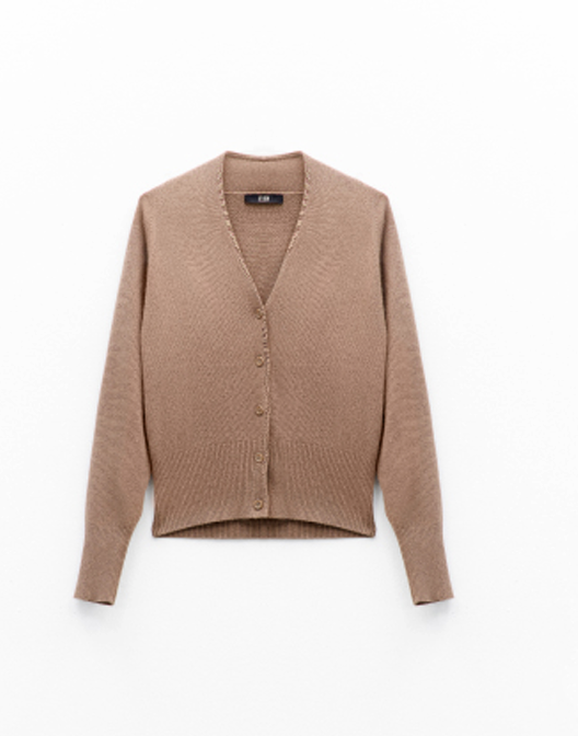 Cardigan em malha suave com decote em V e fecho frontal com botões tonais. O corte ligeiramente curto e a base canelada criam uma silhueta delicada e ajustada, perfeita para sobreposições elegantes.