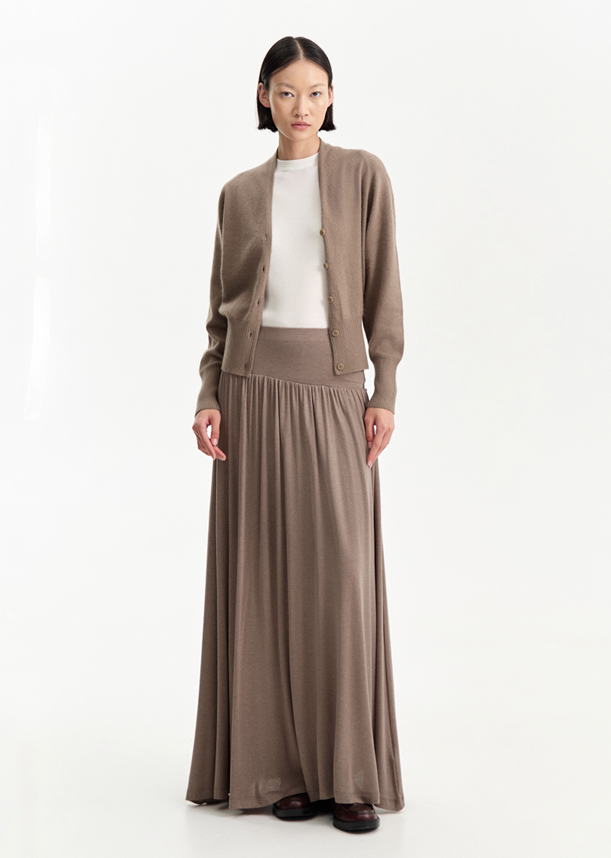 Taupe fine-knit cardigan — minimal elegance and timeless comfort.