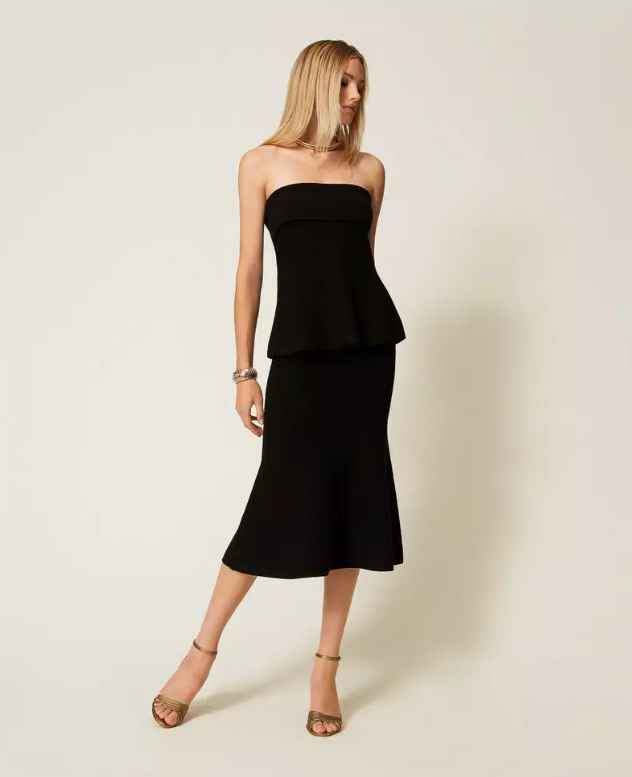 Stretch viscose knit bustier top featuring a structured bandeau and a godet detail that adds subtle volume at the hem. The slightly flared silhouette enhances the body’s natural lines while maintaining a fluid, modern look. A statement yet versatile piece, perfectly aligned with the Fall/Winter 2025-26 “Modern Femininity” trend — where sculptural cuts and sleek black textures redefine sensual minimalism.