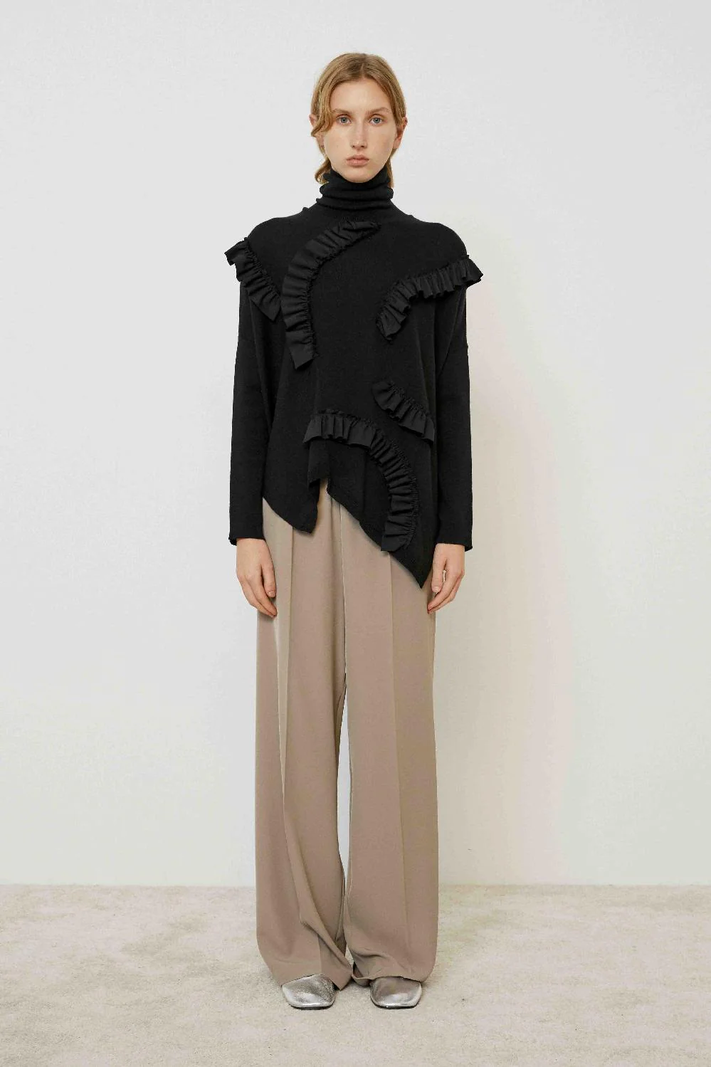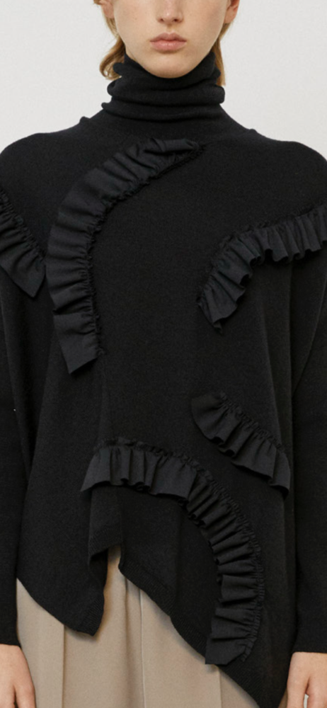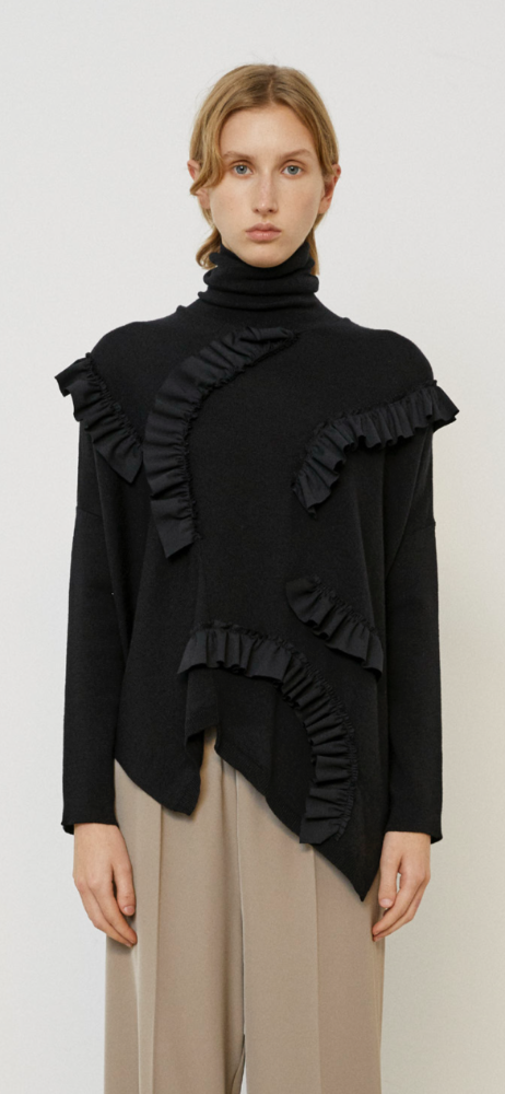 Uma interpretação escultural da malha clássica, esta camisola de gola alta destaca-se pelos folhos aplicados em linhas assimétricas que desenham o corpo de forma artística e contemporânea.