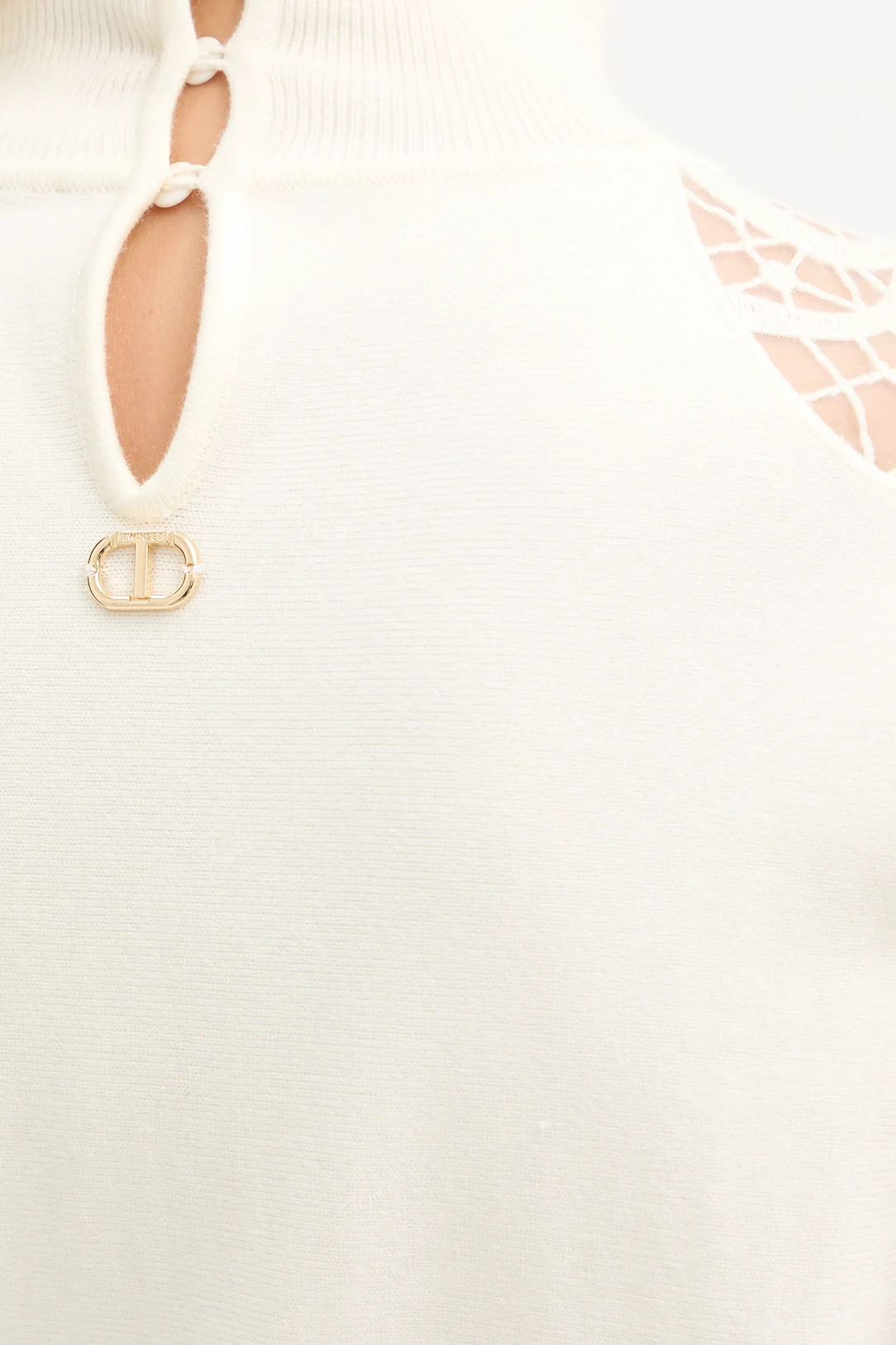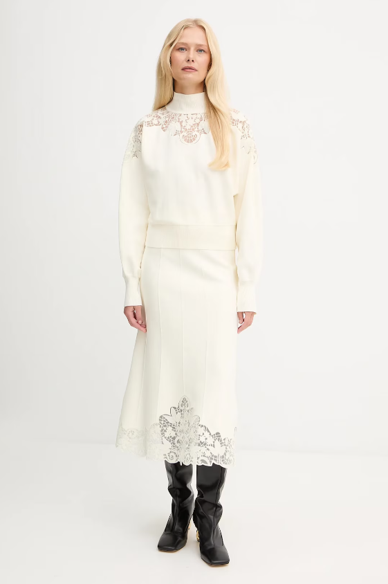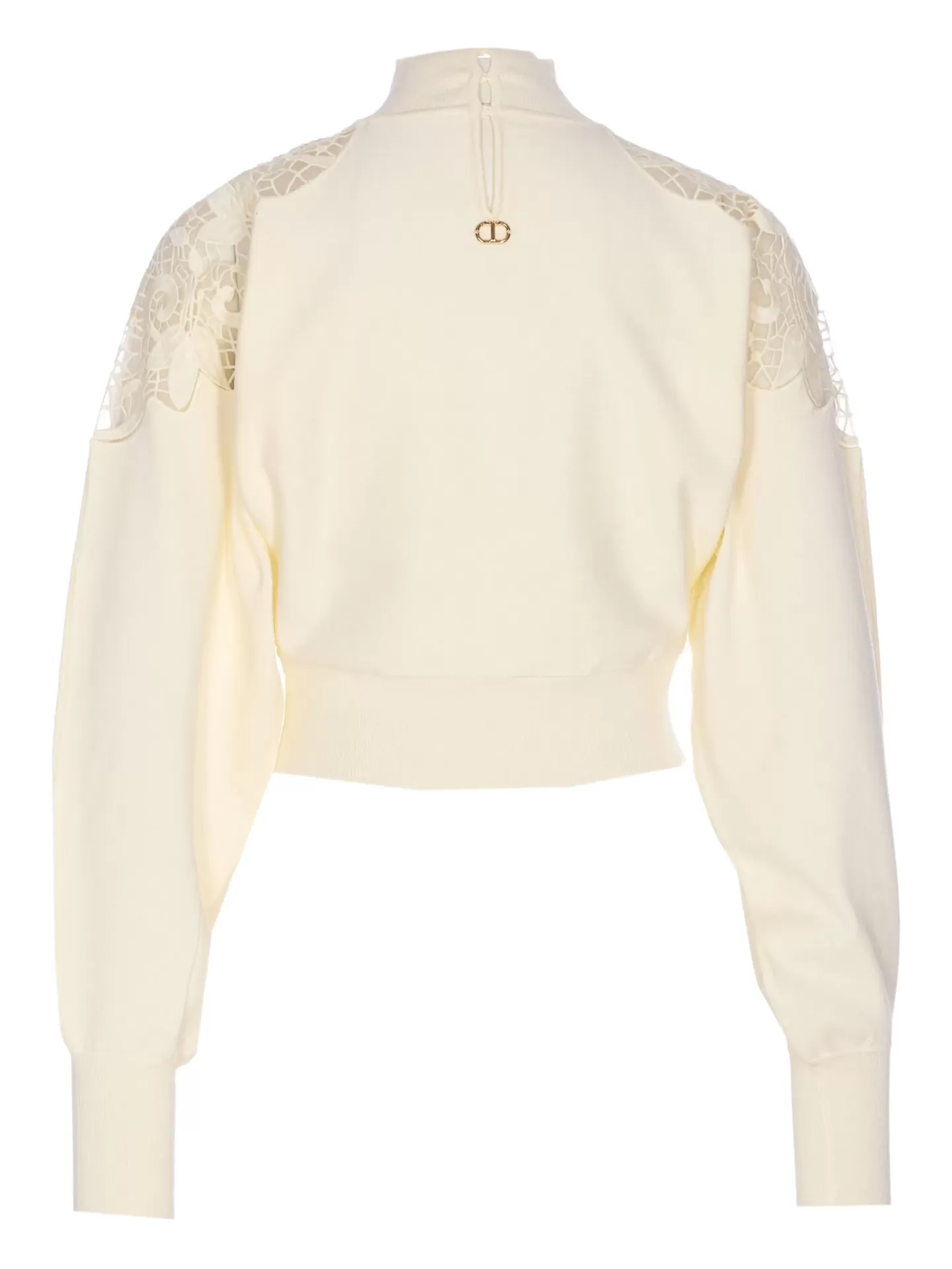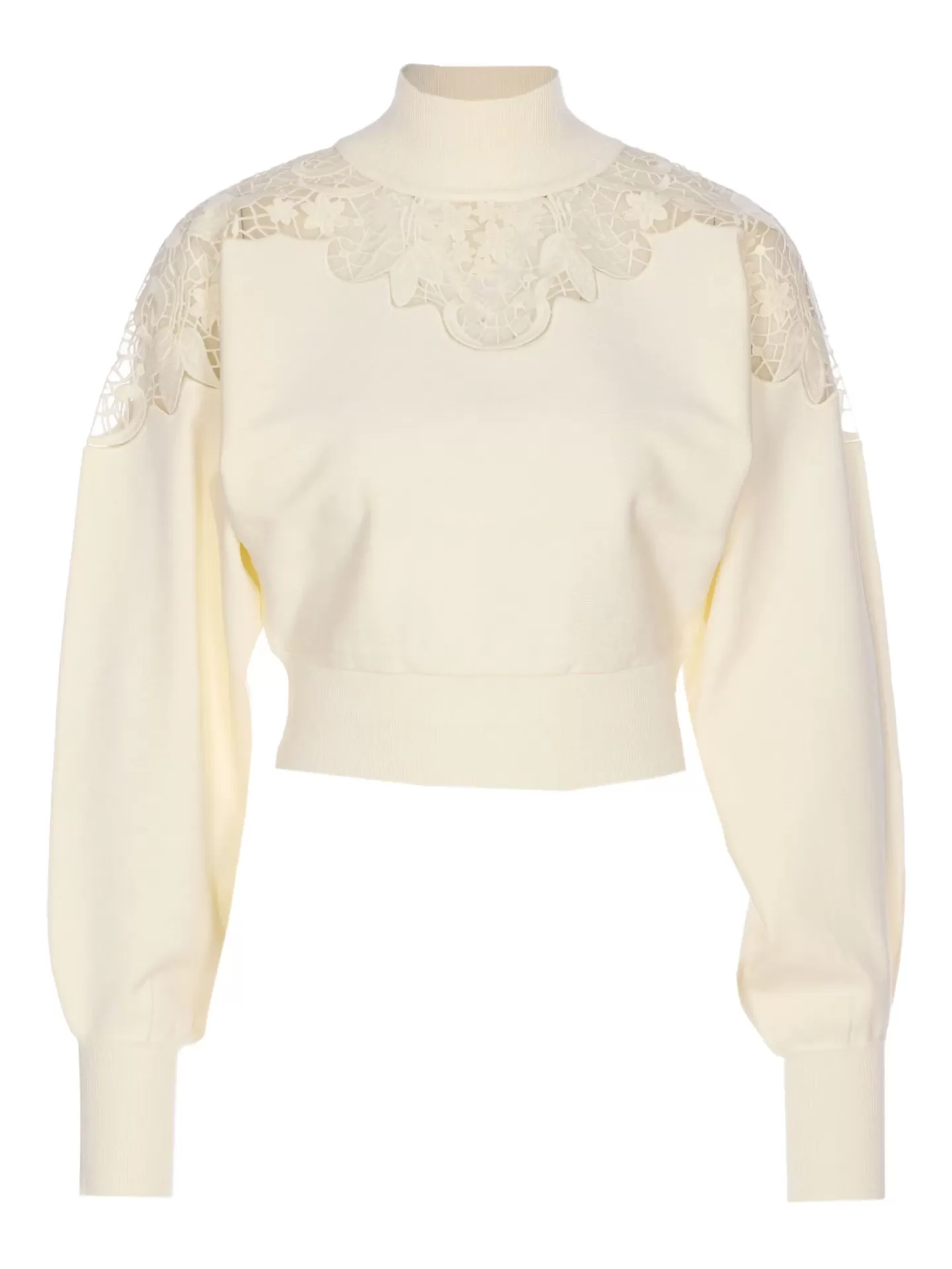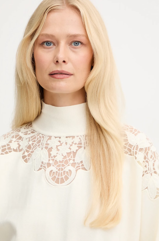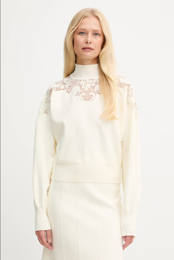 Off-white high-neck sweater featuring delicate lace and embroidered inserts across the shoulders and neckline. The slightly cropped cut and long sleeves bring a refined, feminine silhouette with a subtle romantic edge — blending soft texture with a modern sense of ease. Crafted in a viscose and polyester blend, it strikes the perfect balance between comfort and sophistication.