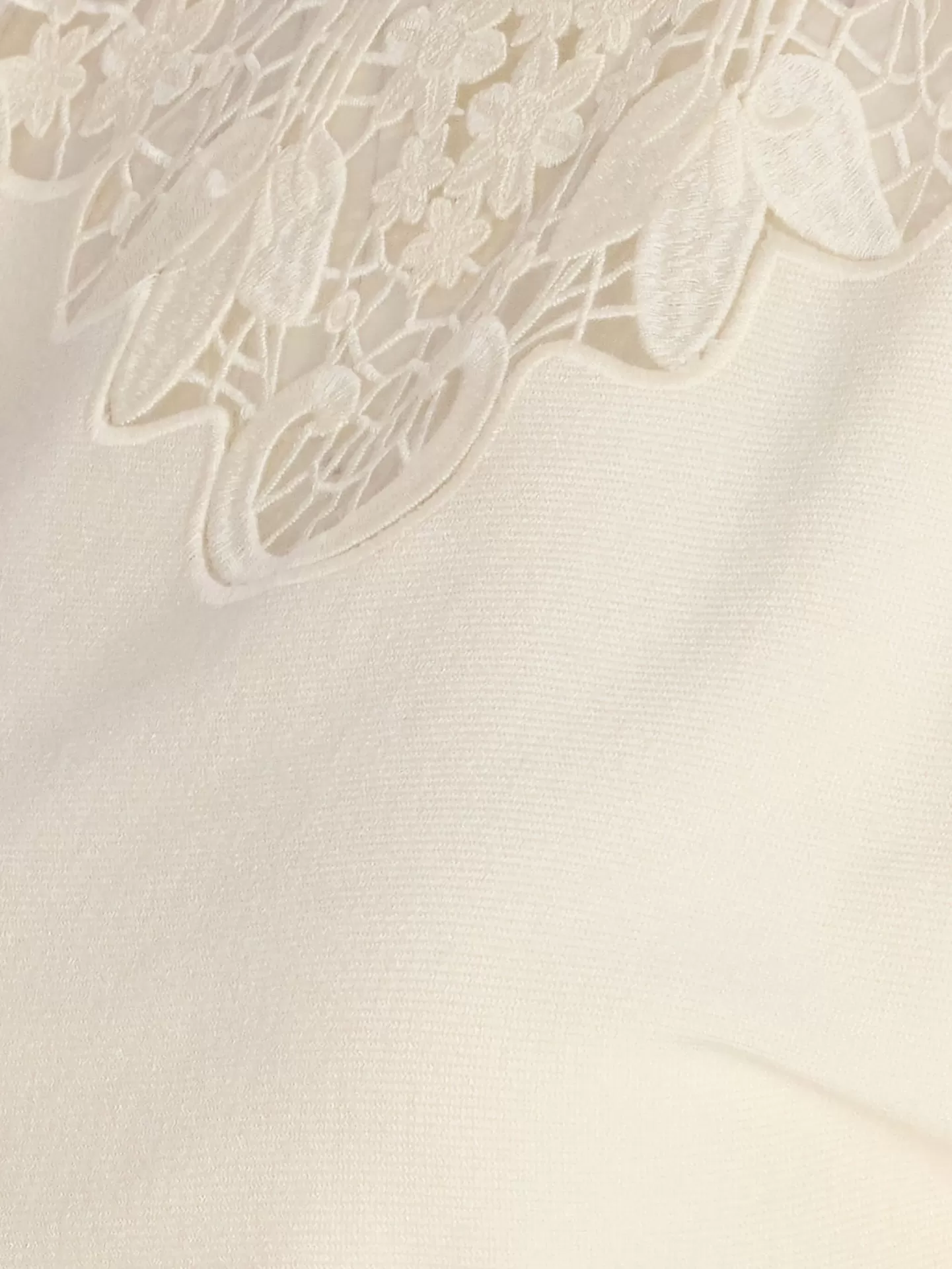 Camisola em tom off-white com gola alta e delicados apontamentos de renda e bordado nos ombros e decote. O corte ligeiramente curto e as mangas compridas conferem-lhe uma elegância subtil e feminina, com um toque romântico que se adapta facilmente ao quotidiano contemporâneo. Uma peça que combina a textura suave da viscose com o brilho discreto do poliéster, traduzindo o equilíbrio entre conforto e requinte.