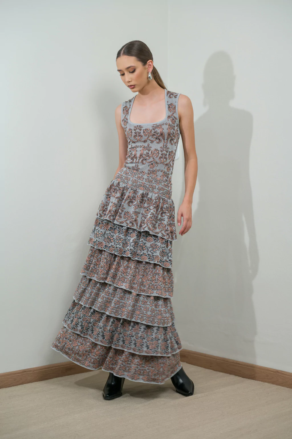 The Lídia Skirt is an elegant piece in printed knit that blends CP’s classic silhouette with delicate tiered ruffles. Each layer reveals a unique and exclusive print, creating a rich and dynamic visual effect. Its sophisticated texture ensures a soft touch and flawless drape, making it ideal for refined outfits. Styling tip: pair it with the Letícia Bodysuit for a harmonious and charming look.