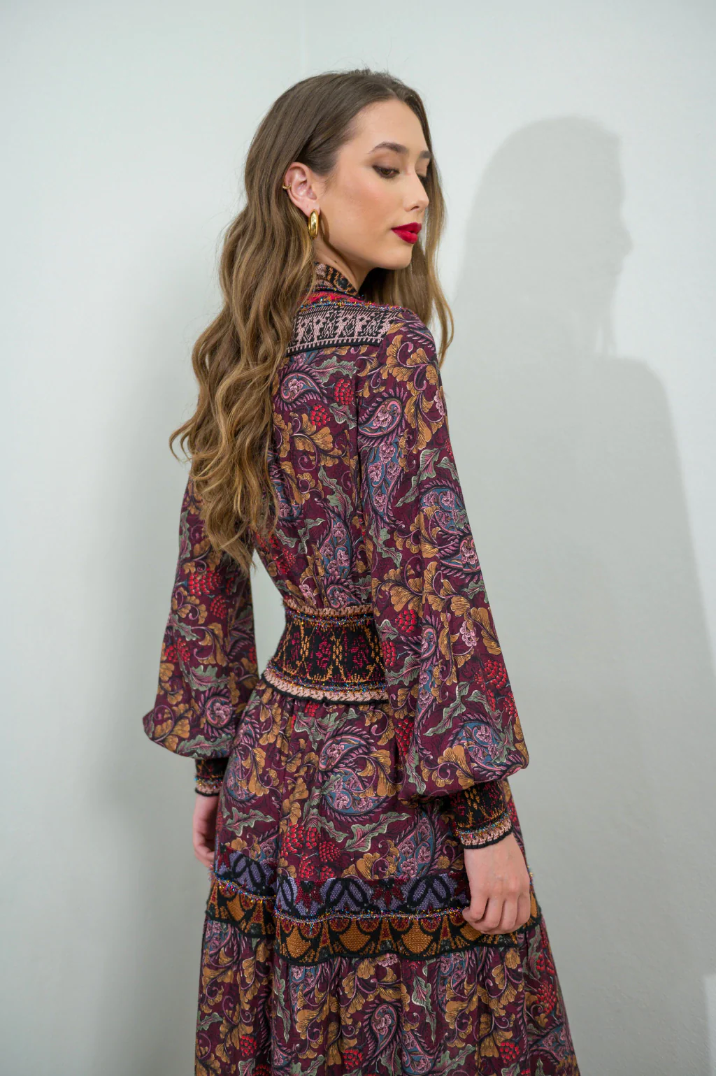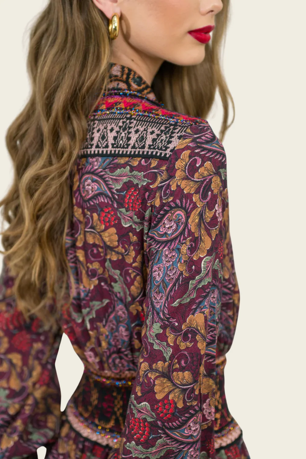 The Franciele Dress by Cecilia Prado redefines sophistication with its chemise-inspired silhouette, merging comfort and luxury. Crafted in light jacquard tricot, it showcases the brand’s signature print — a rich tapestry of wine, amber and sapphire tones that celebrate artisanal craftsmanship.