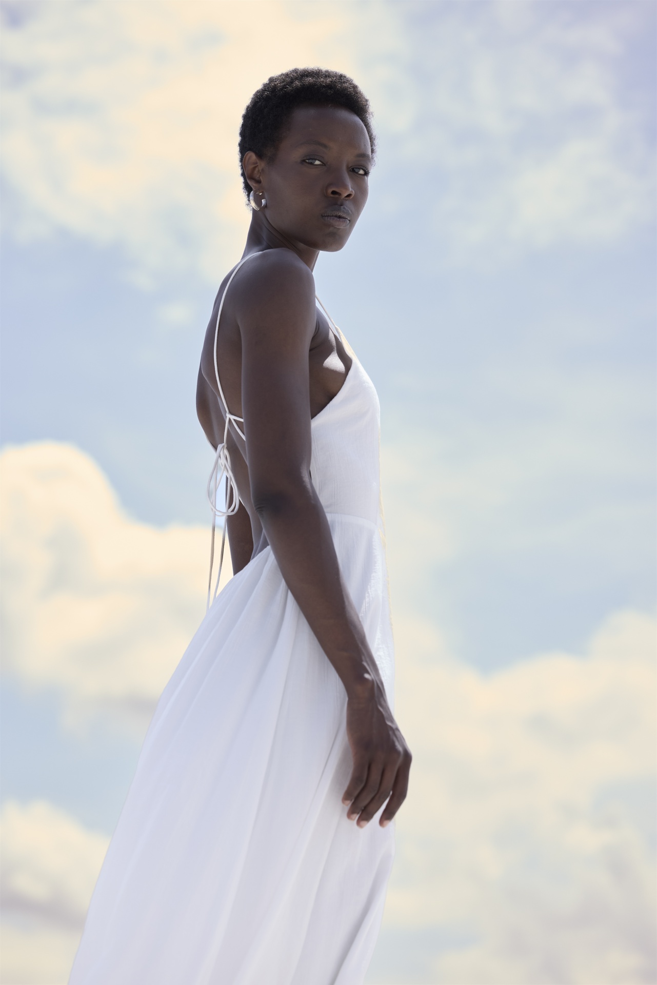Este vestido longo em branco etéreo destaca-se pela elegância minimalista e fluidez feminina. As alças finas tipo spaghetti cruzam delicadamente nas costas, criando um detalhe arquitetónico subtil que valoriza a silhueta. Confeccionado em tecido leve e suave, o vestido desliza pelo corpo com naturalidade, tornando-o perfeito para ocasiões sofisticadas de Primavera/Verão 2026.