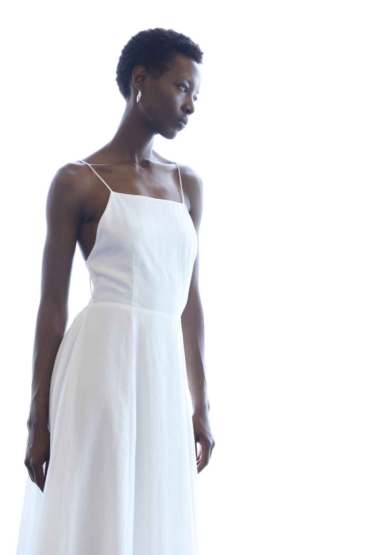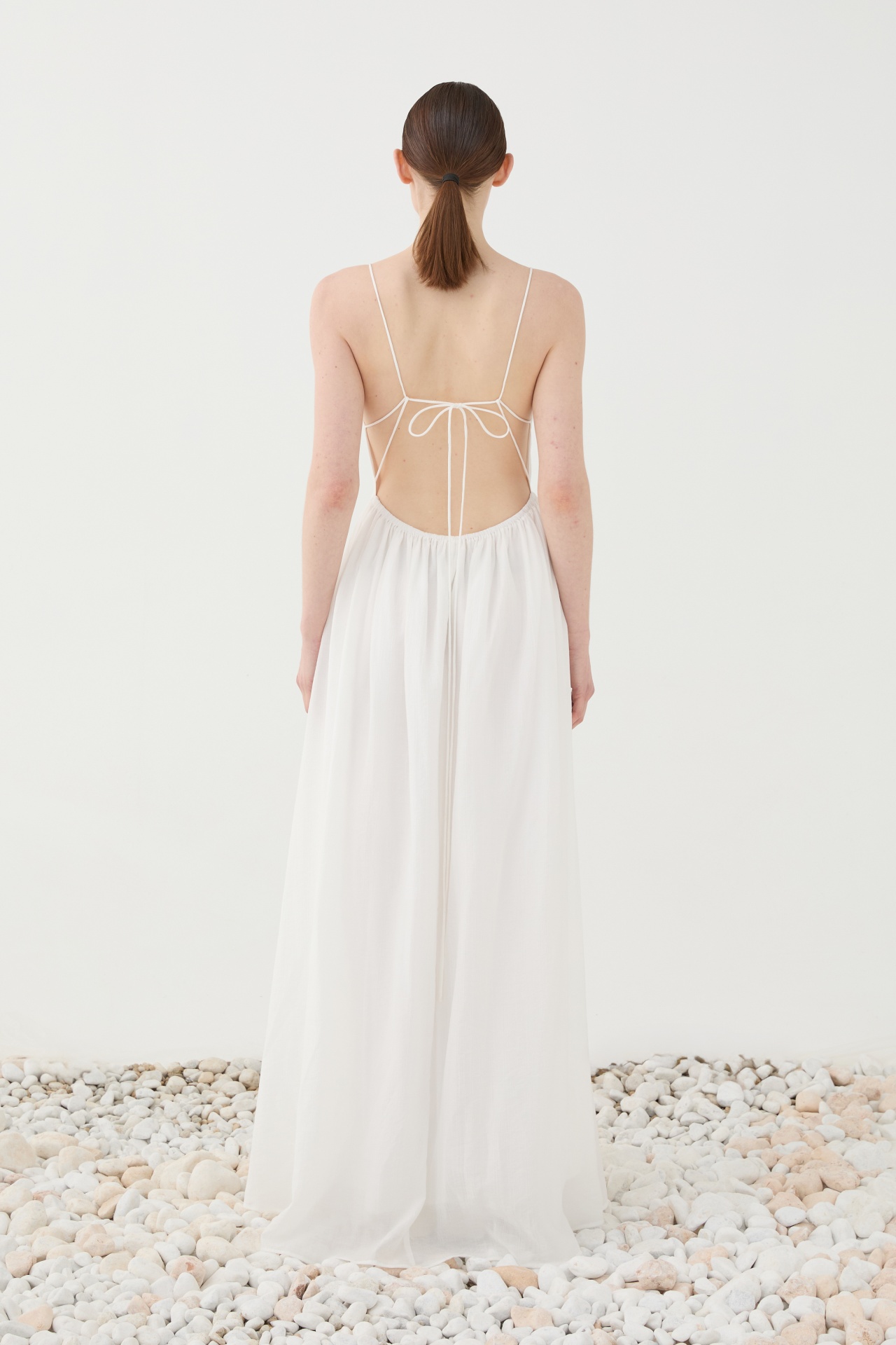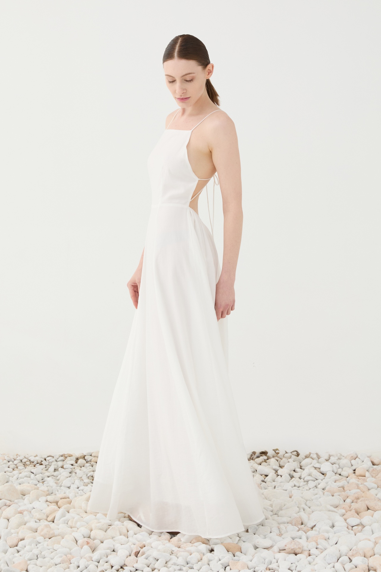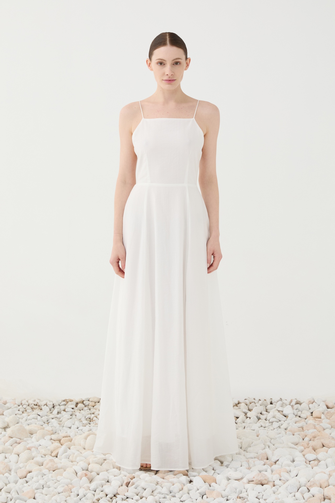 This ethereal white long dress stands out for its minimalist elegance and feminine flow. The fine spaghetti straps cross delicately at the back, creating a subtle architectural detail that flatters the silhouette. Crafted from lightweight, soft fabric, the dress drapes effortlessly on the body, making it ideal for sophisticated Spring/Summer 2026 occasions.