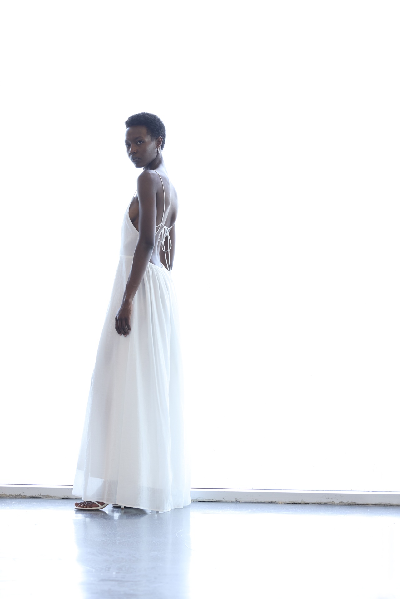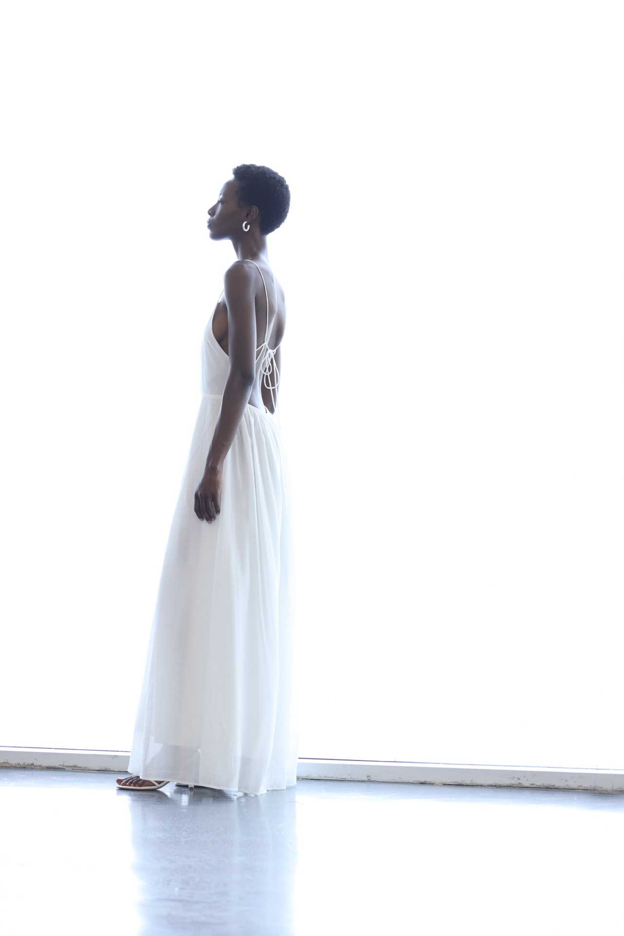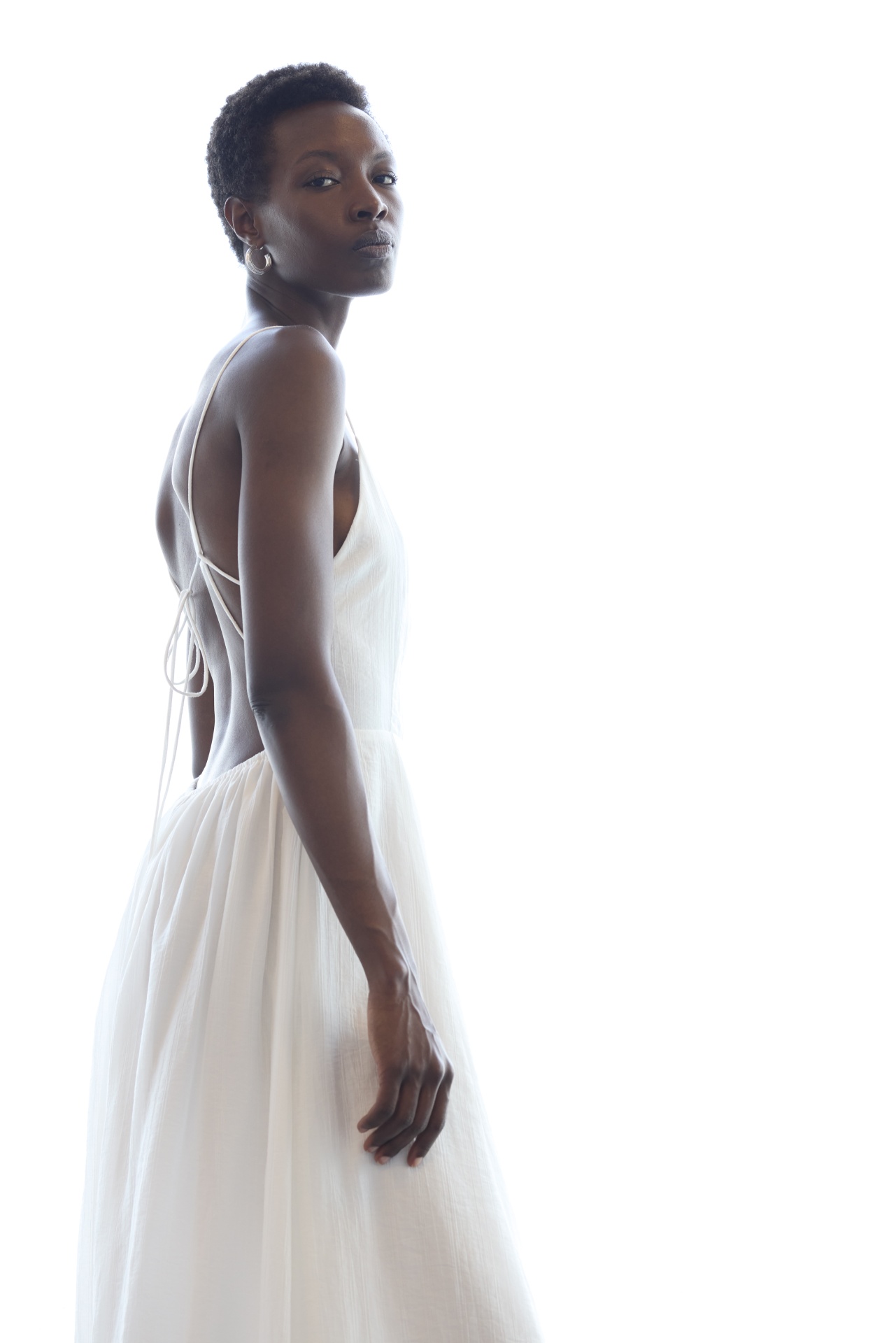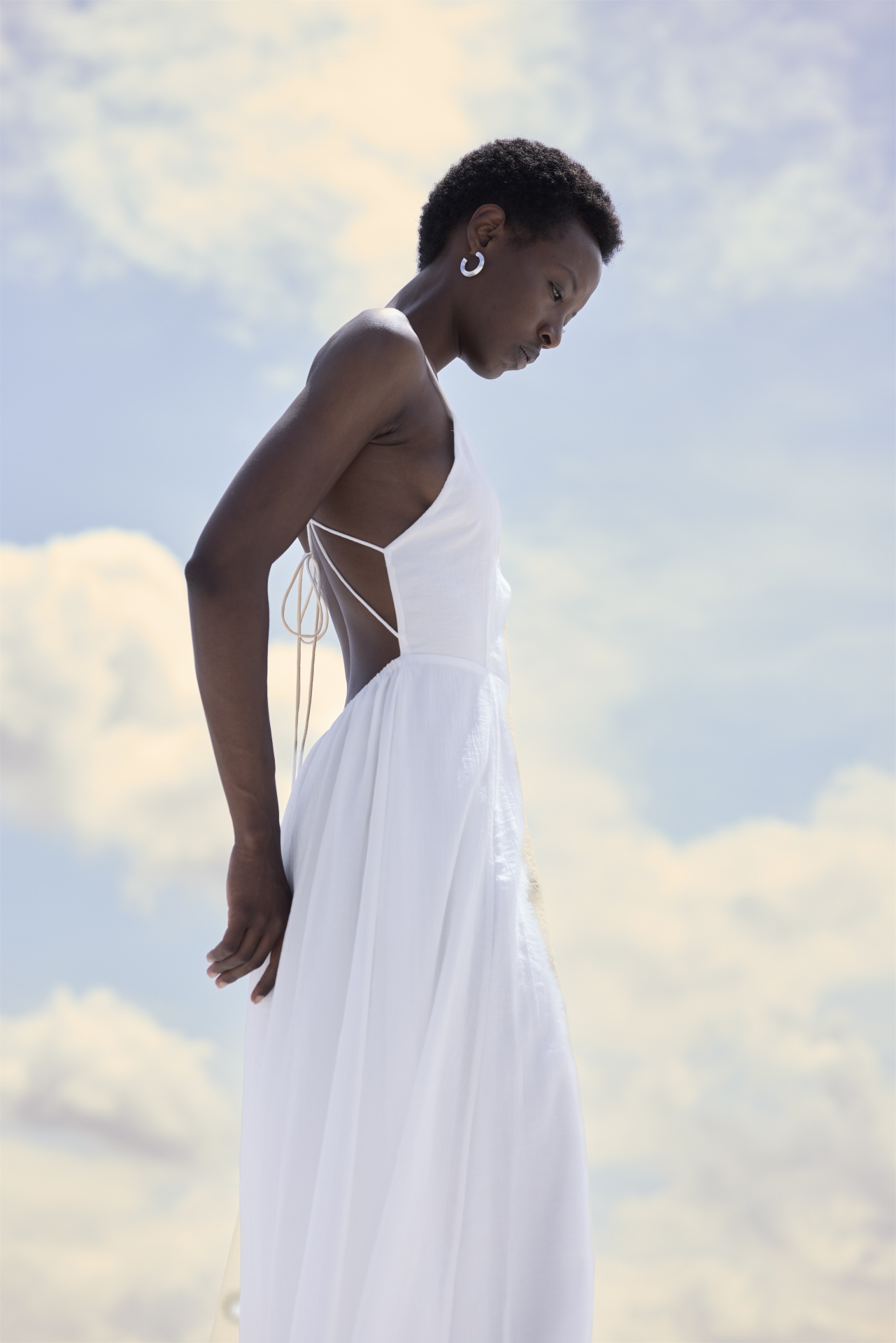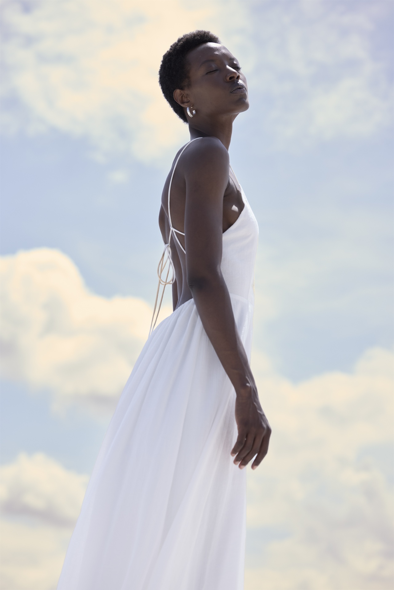 This ethereal white long dress stands out for its minimalist elegance and feminine flow. The fine spaghetti straps cross delicately at the back, creating a subtle architectural detail that flatters the silhouette. Crafted from lightweight, soft fabric, the dress drapes effortlessly on the body, making it ideal for sophisticated Spring/Summer 2026 occasions.