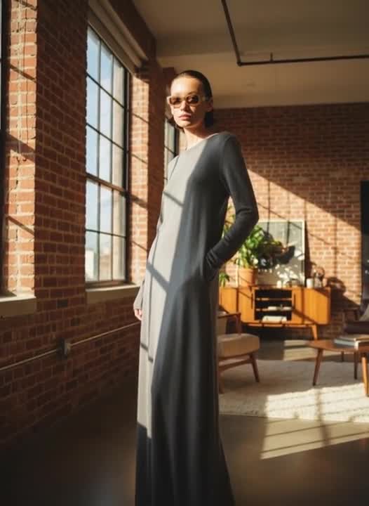 Com mangas compridas e decote redondo simples, a silhueta segue o corpo com elegância minimalista, traduzindo conforto e modernidade numa única peça.