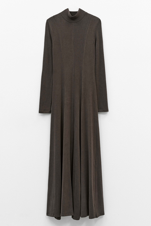 Features a high neckline, long sleeves, and vertical seam lines that elongate the silhouette.