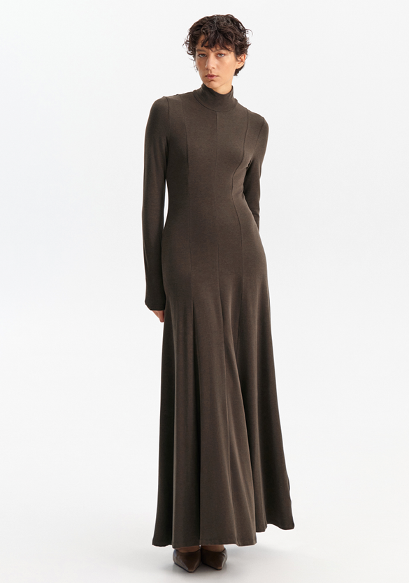 Vestido longo de manga comprida em malha suave de algodão com toque elástico, que molda a silhueta sem apertar.