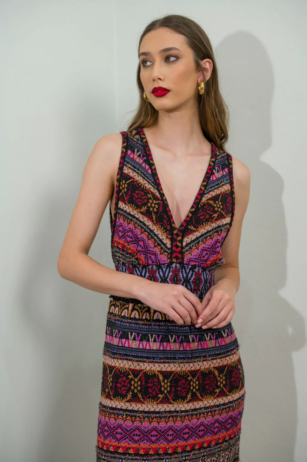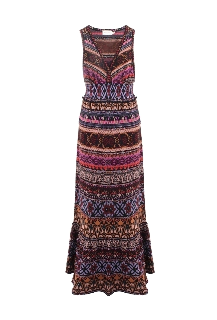 The Celia long knit dress embodies effortless sophistication and contemporary elegance. Crafted in soft tricot, it features a sleeveless design with a deep V neckline that enhances the feminine silhouette. The rich mix of patterns and vibrant colours creates a harmonious visual rhythm, while the matching knitted hem adds balance and fluidity to the piece.