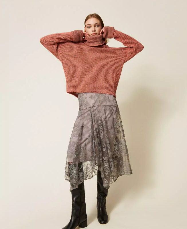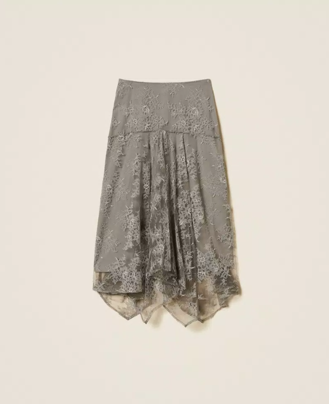 Long lace skirt with a basque waist and draping, finished with a handkerchief hem that adds lightness and fluidity. The side zip fastening ensures a flawless fit, while the polyester lining provides comfort and movement.