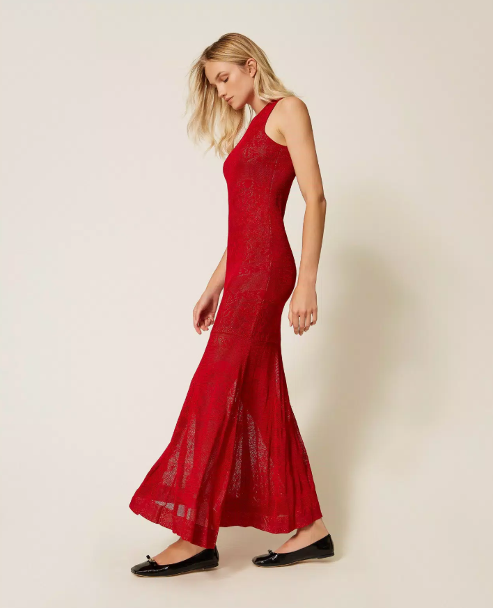 Red dominates the season as the ultimate symbol of bold femininity. Refined viscose knits embrace transparency and architectural shapes, redefining evening glamour with texture and fluid structure.