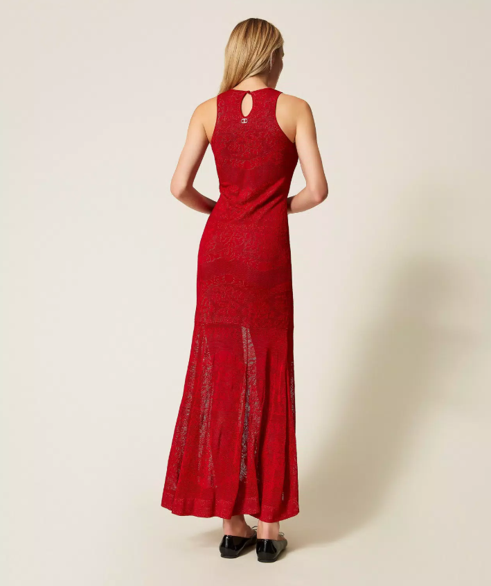 Long viscose knit dress featuring a two-tone double construction with openwork detailing that highlights the design. It comes with a round neckline, teardrop opening with button on the back, and a flared hem that contrasts with the fitted top, creating a sleek, feminine silhouette. A sophisticated piece that merges sensuality, craftsmanship and modern elegance.