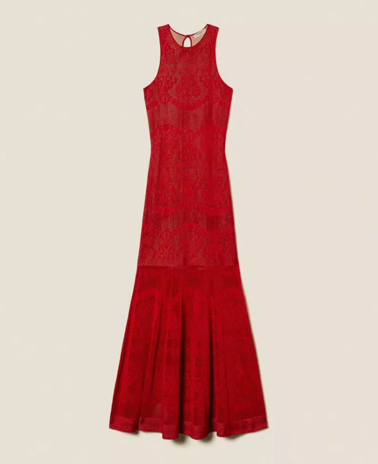 Vestido longo em malha de viscose com construção dupla em dois tons, trabalhada em openwork que realça o desenho e confere leve transparência. Apresenta decote redondo, abertura em forma de gota com botão nas costas e saia ampla que contrasta com o corte justo do tronco, criando uma silhueta elegante e fluida. Uma peça que combina sensualidade, textura e sofisticação moderna.
