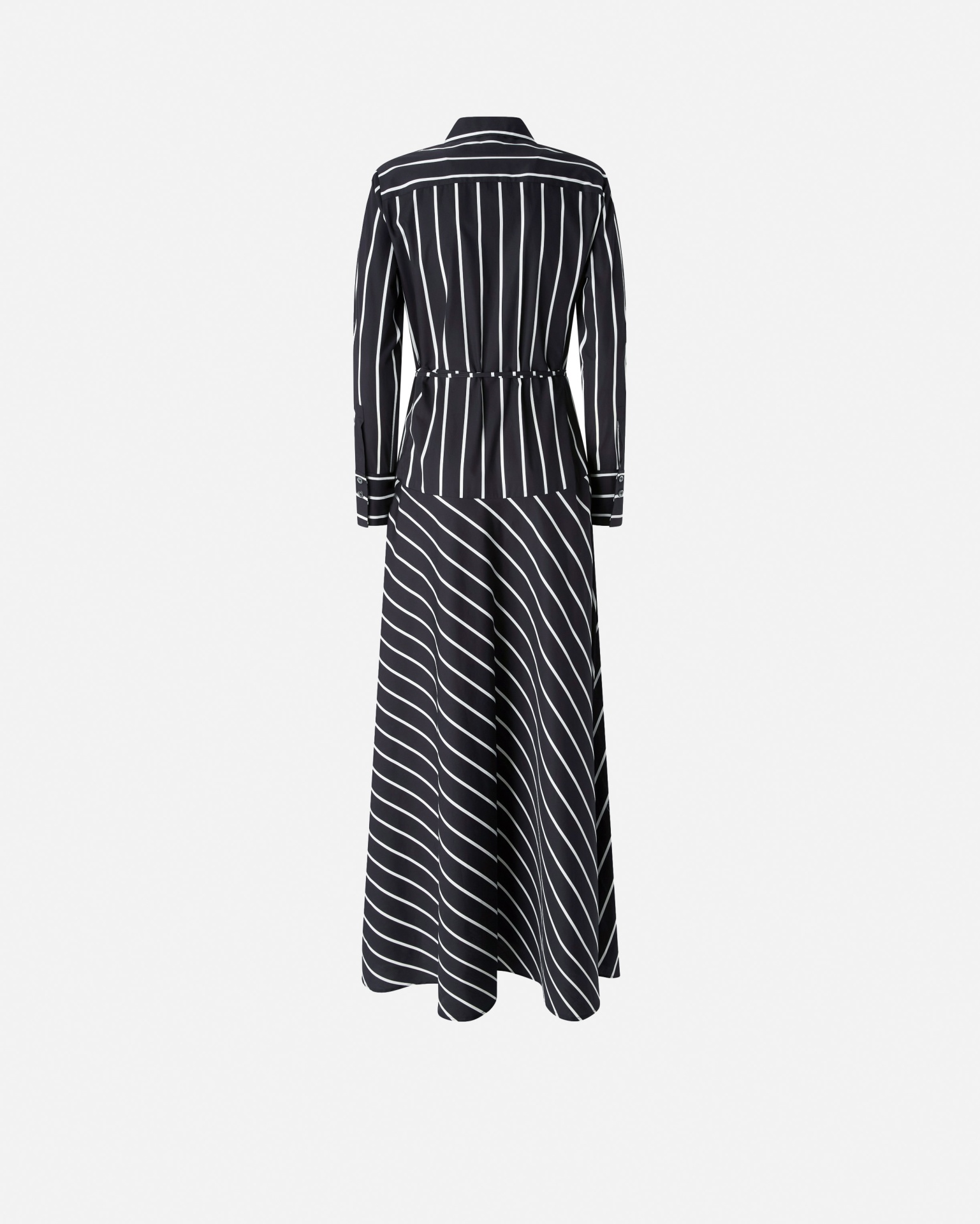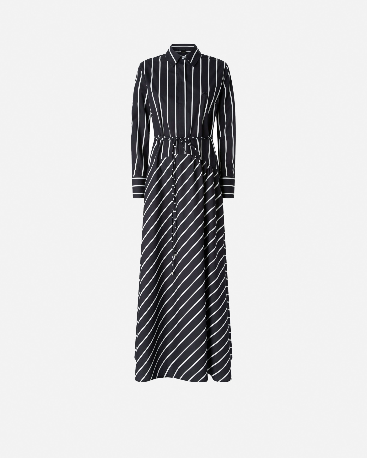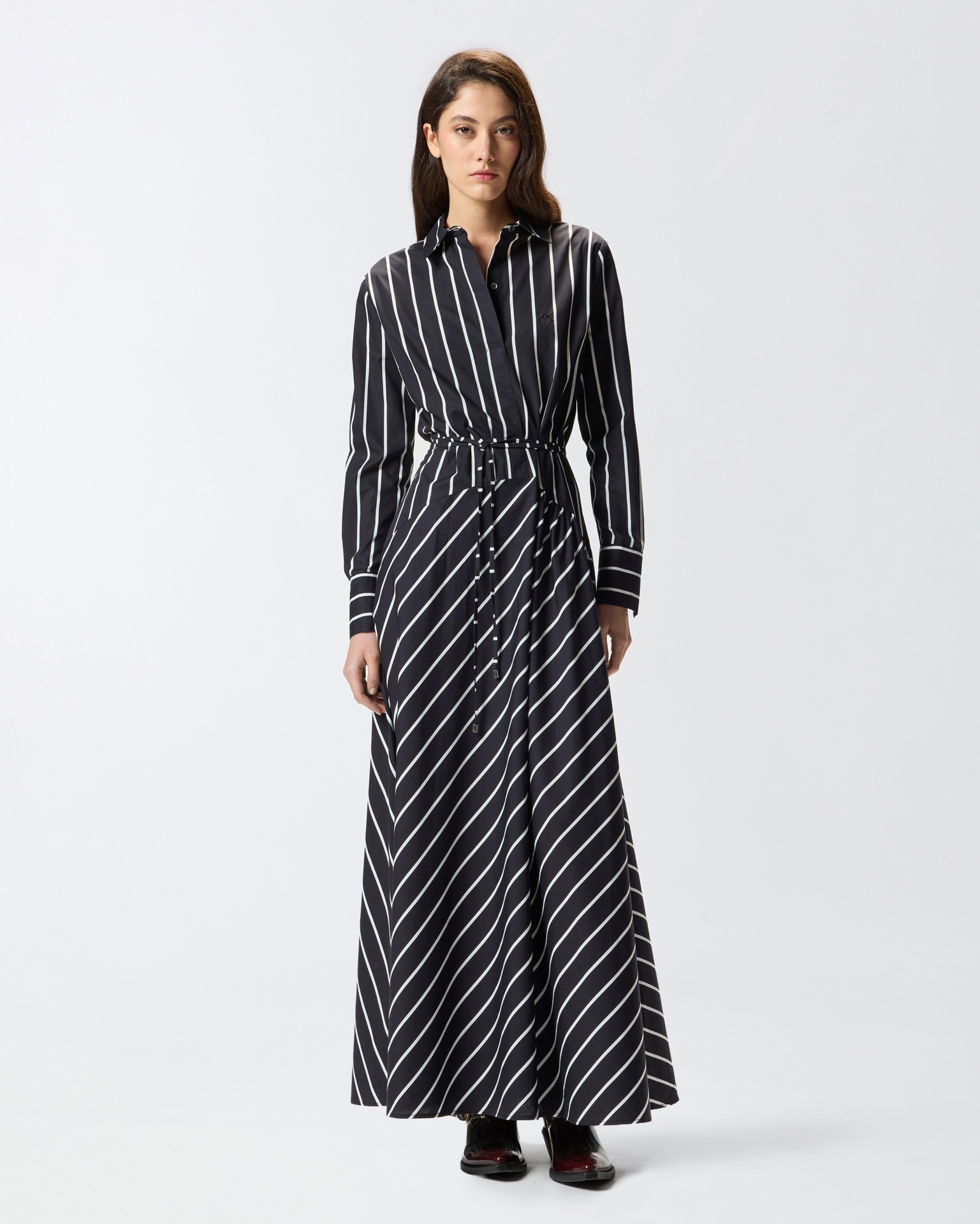 Vestido-camisa comprido e cintado, com colarinho clássico, mangas compridas com punhos abotoados e cintura ajustável com faixa no mesmo tecido. Confeccionado em popelina 100% algodão com certificação OEKO-TEX®, que garante a ausência de substâncias nocivas, apresenta uma estampa digital de riscas em direções contrastantes, realçando a luminosidade e o dinamismo das cores.