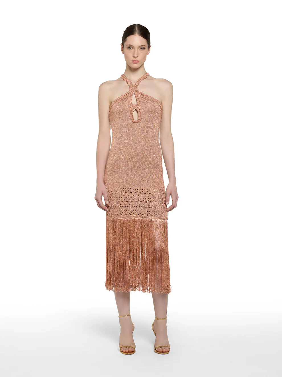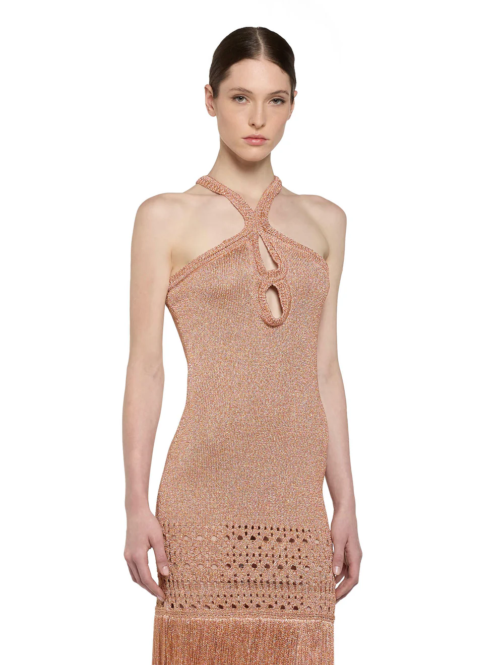 Step into the spotlight with this 7/8-length lurex knit dress, featuring an alluring double teardrop neckline and criss-cross halter straps that elegantly frame the shoulders.
