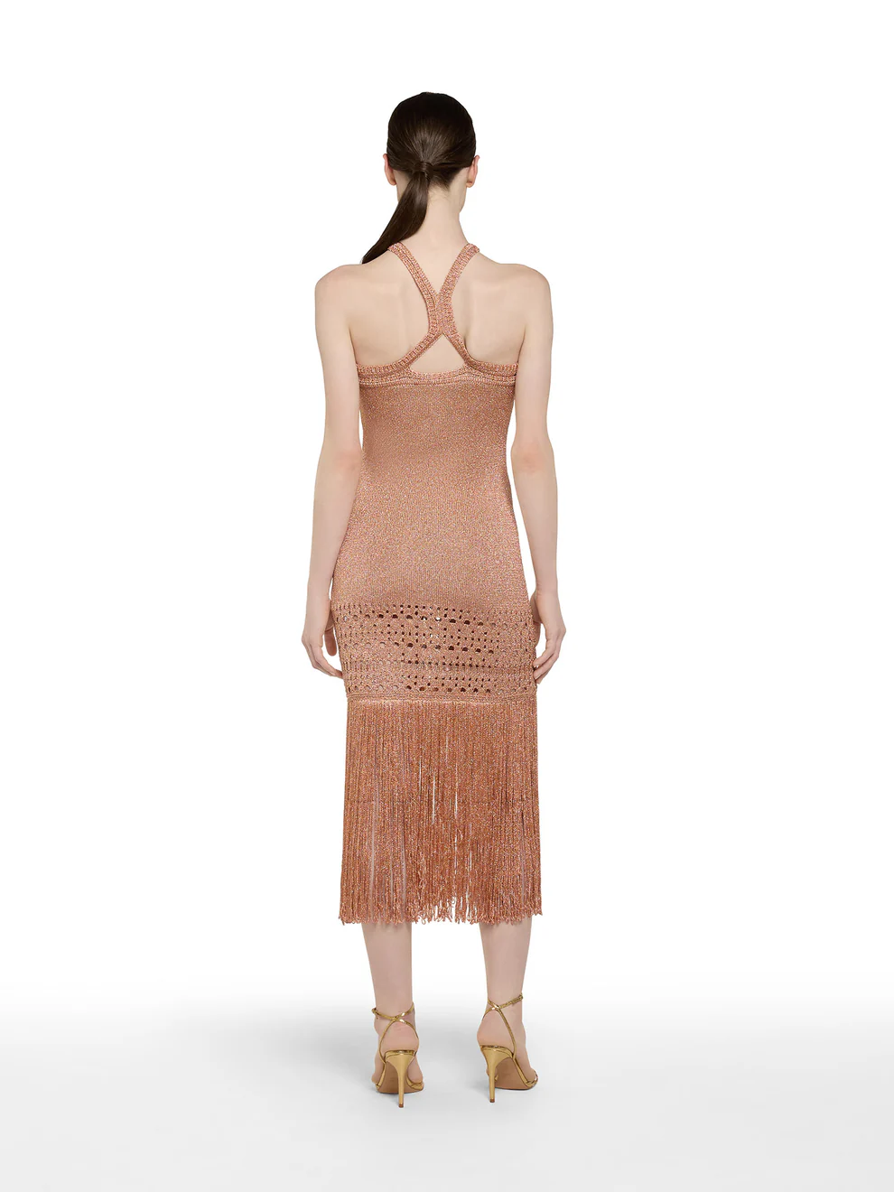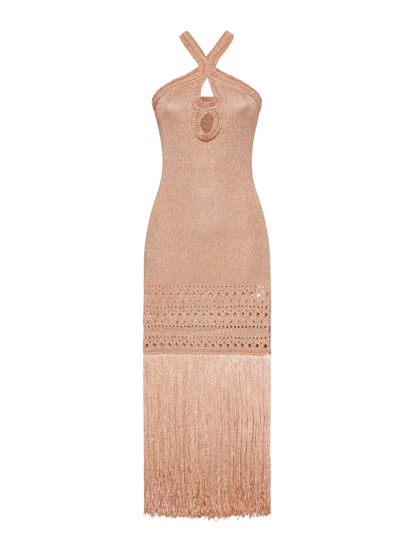 Rose moiré lurex knit dress with teardrop neckline and maxi fringe