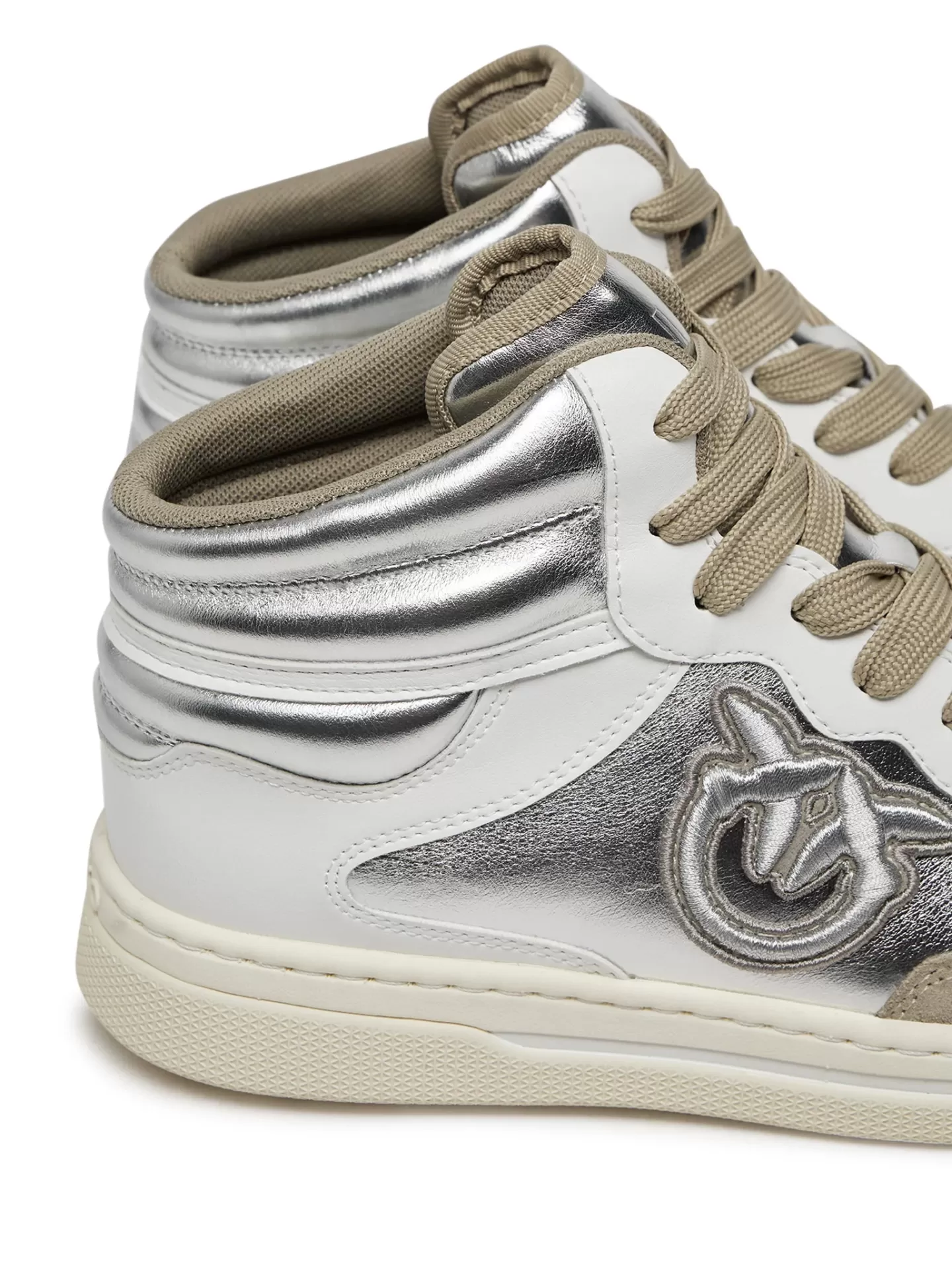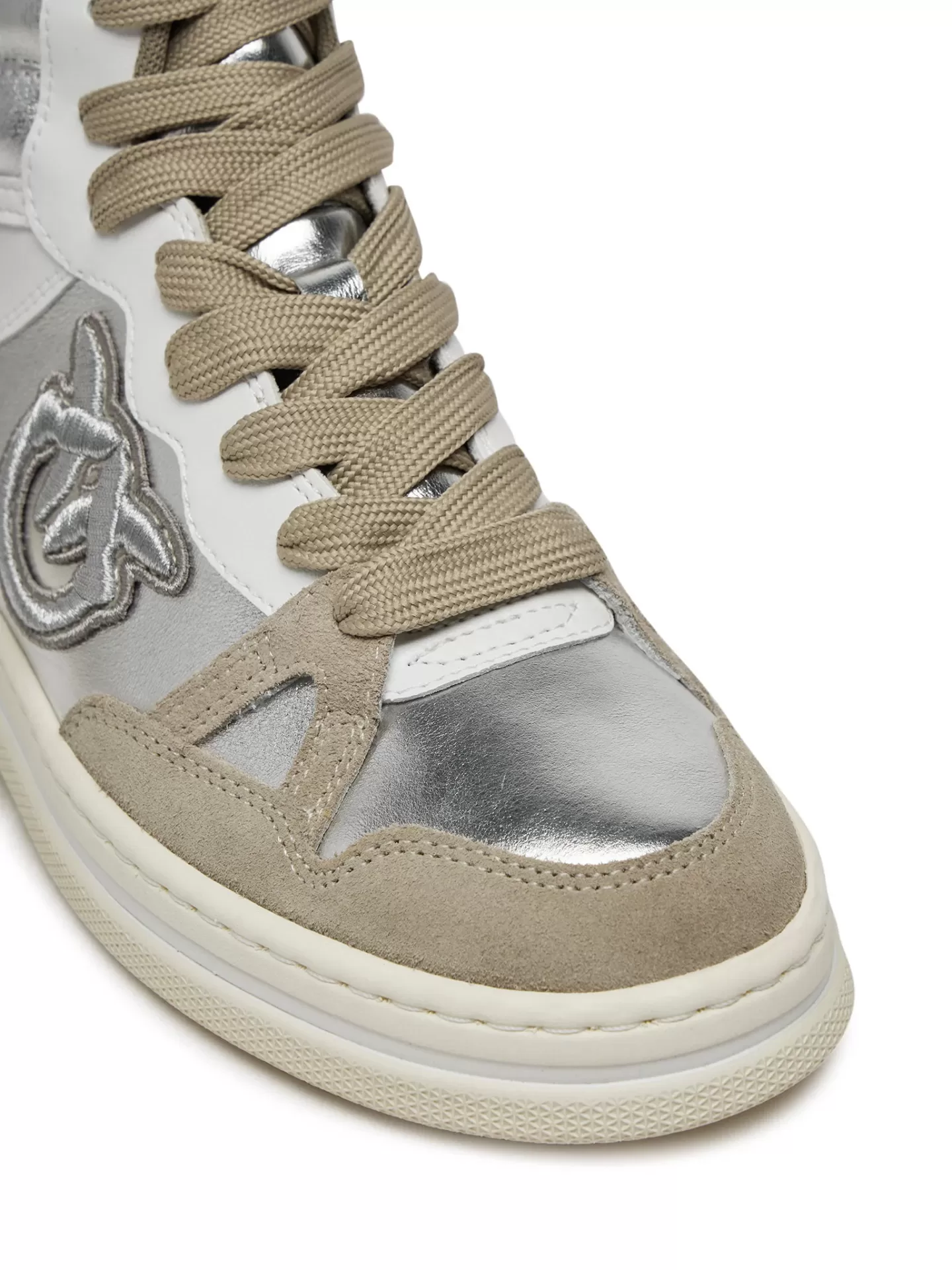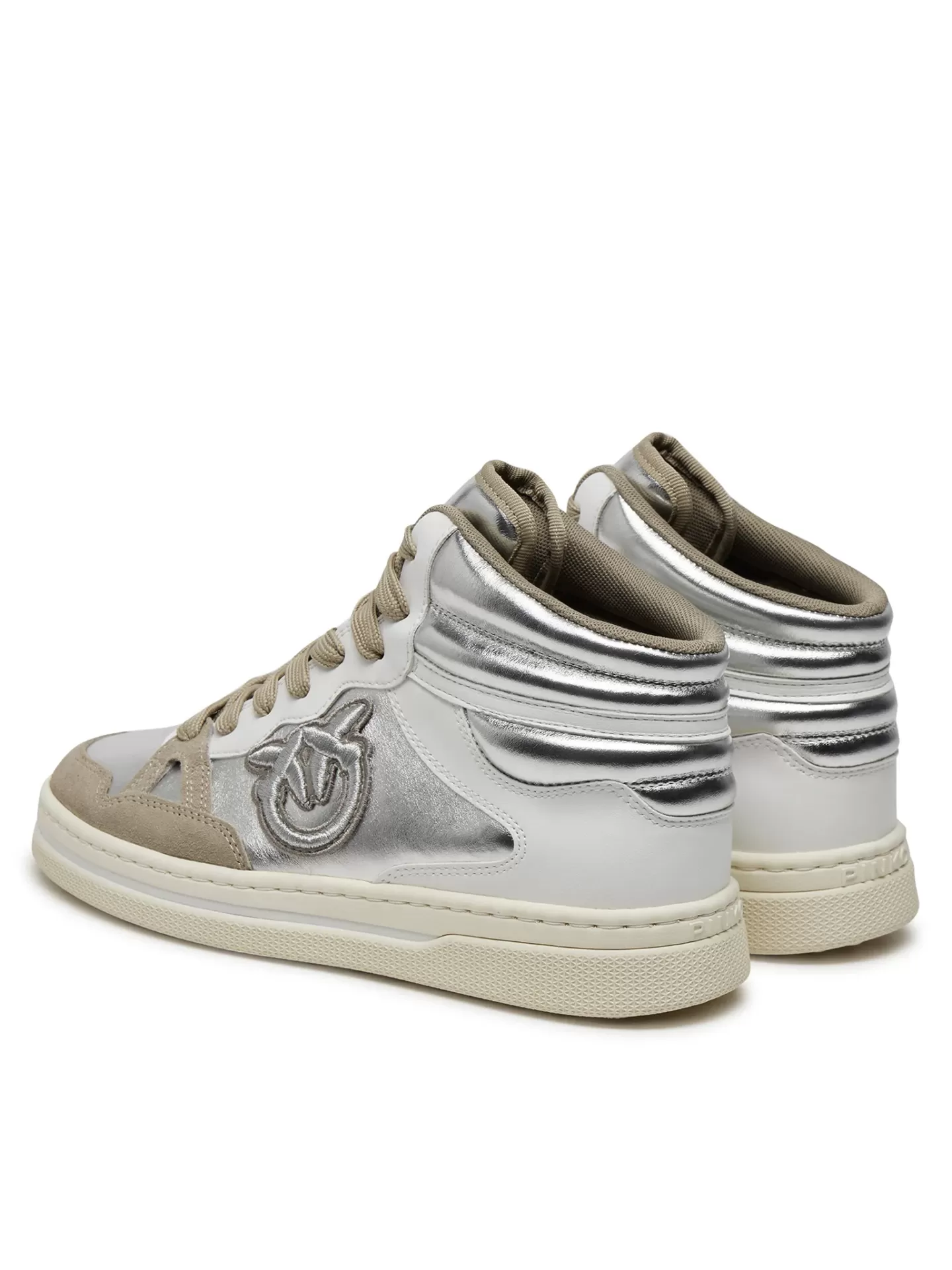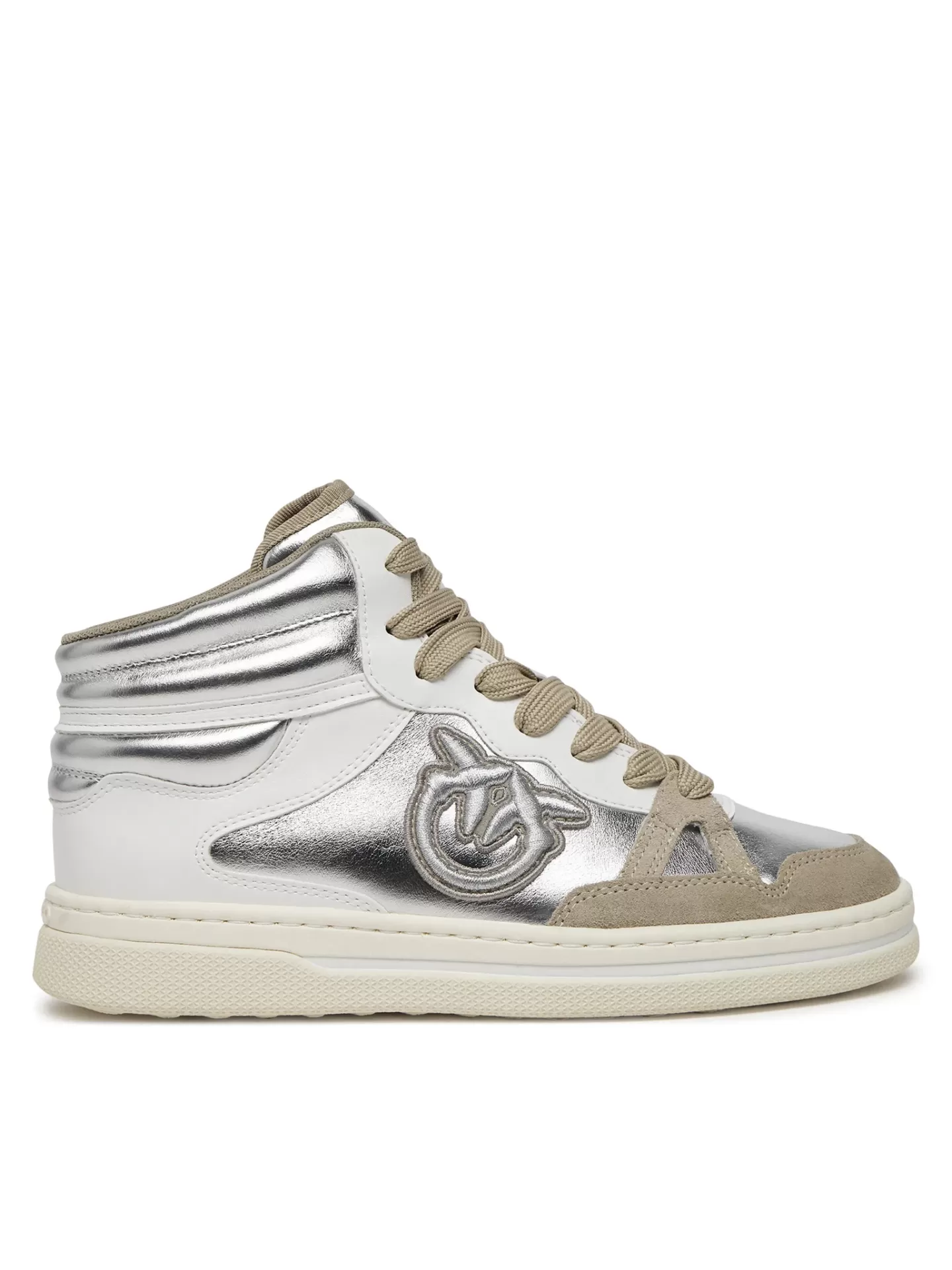 A retro classic with a modern edge. The PINKO Mandy 02 sneakers blend vintage basketball inspiration with silver metallic panels, white nappa leather, and beige suede trims, finished with the signature embossed Love Birds logo.