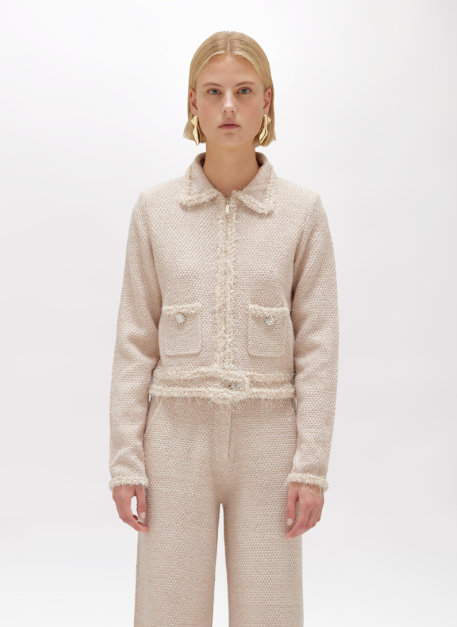 O bon-ton reinterpretado pela Blugirl. Casaco em malha mouliné com efeito tweed e acabamento bicolor com franjas delicadas a definir as linhas e costuras. Apresenta silhueta boxy, fecho em metal com zíper, gola clássica, mangas compridas com botões nos punhos e bolsos frontais com botões joia em cristal, num elegante efeito de dupla camada.