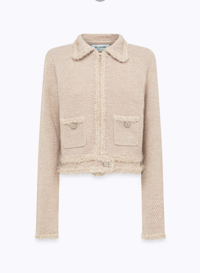 Bon-ton, the Blugirl way. This mouliné knit jacket features a tweed effect and bicolour fringed trims that delicately outline its silhouette. Designed with a boxy fit, metal zip fastening, classic collar, long sleeves with buttoned cuffs, and front flap pockets adorned with crystal jewel buttons, it evokes timeless sophistication with a subtle double-layer effect.