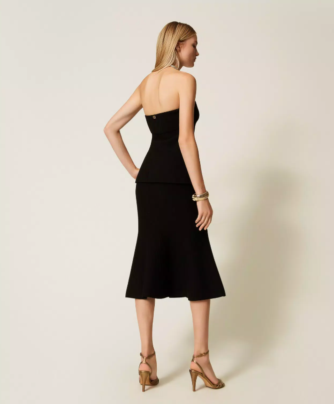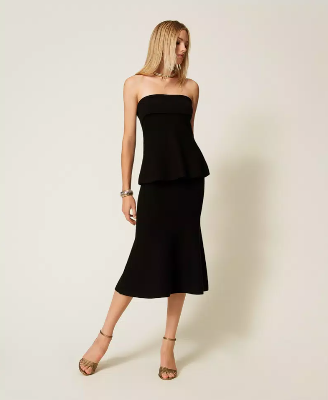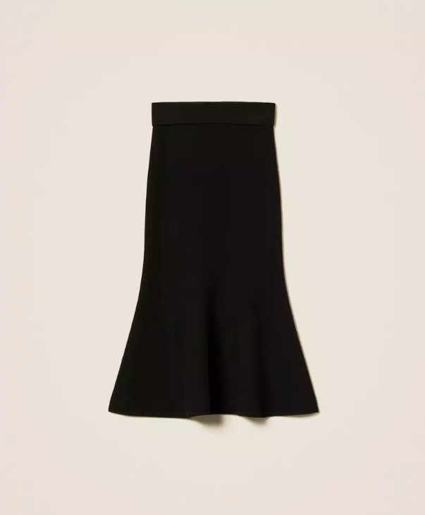 Stretch viscose knit midi skirt featuring a bandeau waistband and a godet insert that creates gentle volume at the hem. The fitted silhouette flares softly for a feminine, fluid look — a timeless piece that defines effortless sophistication.