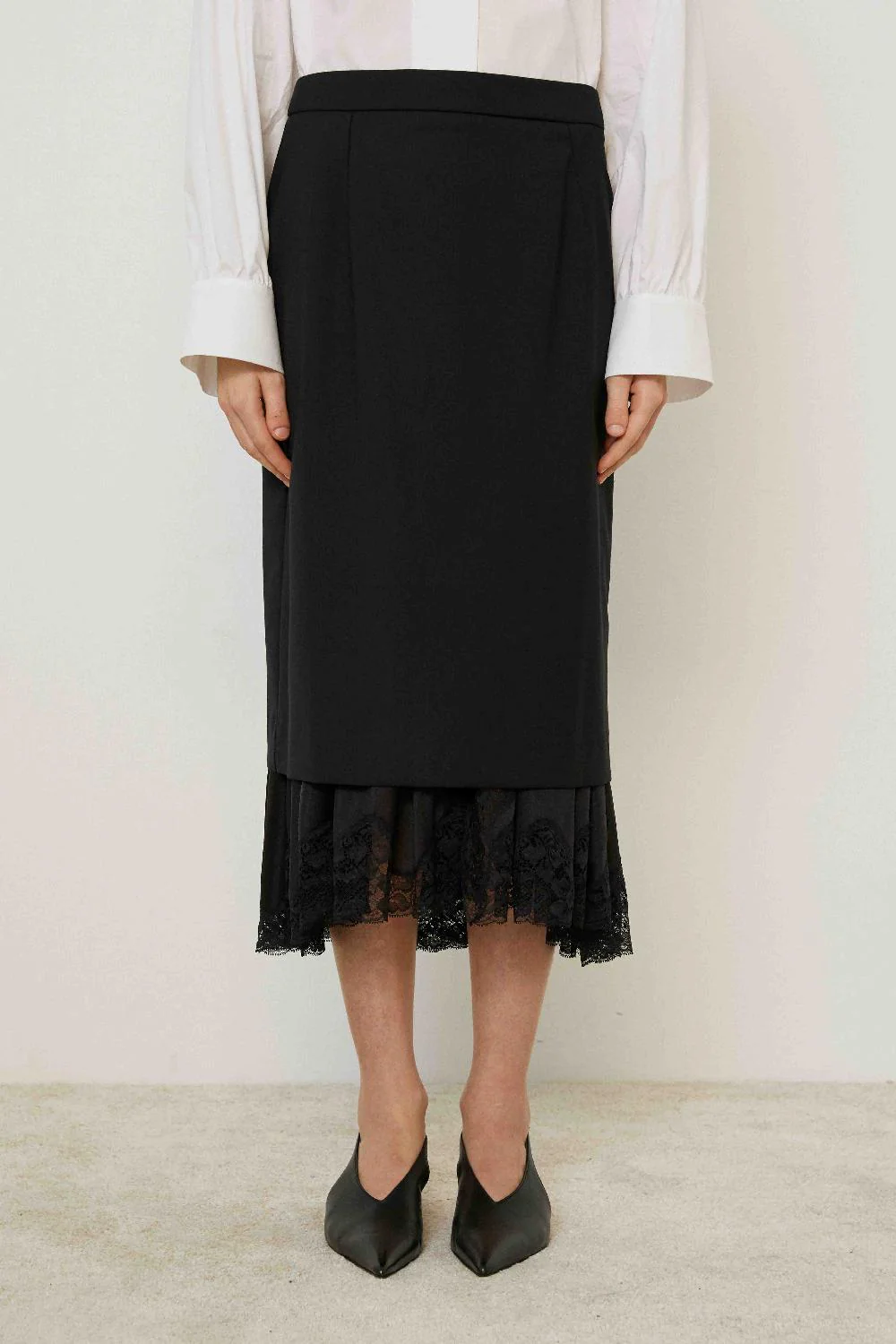 This midi-length wool-blend skirt features a straight, refined silhouette with a concealed back zip and delicate lace detailing along the hem, adding texture and sophistication.