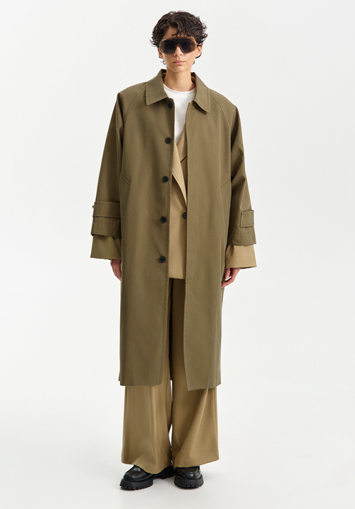 Military green trench coat — timeless minimalism meets utilitarian refinement