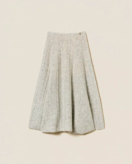 Twinset flared midi skirt crafted from a soft mohair and lurex blend with a wide ribbed texture.