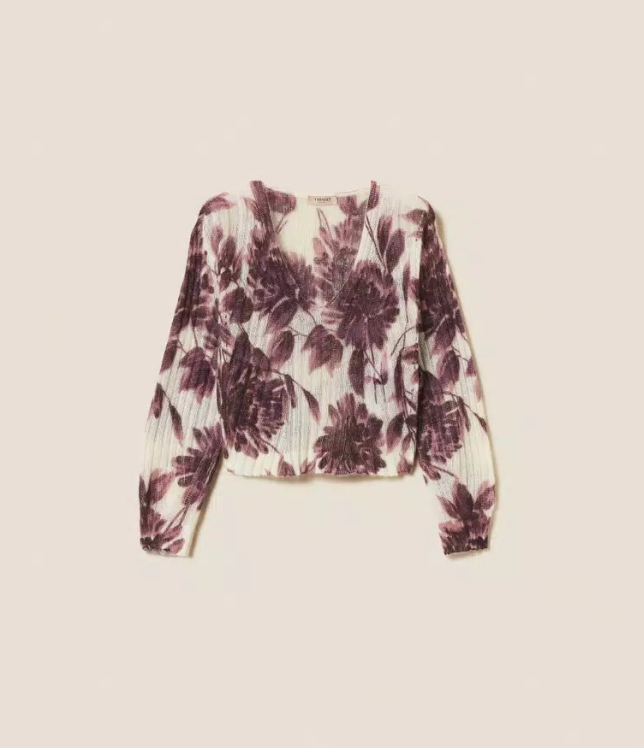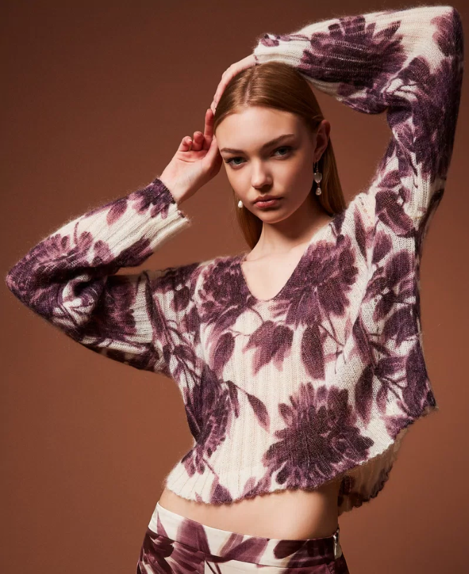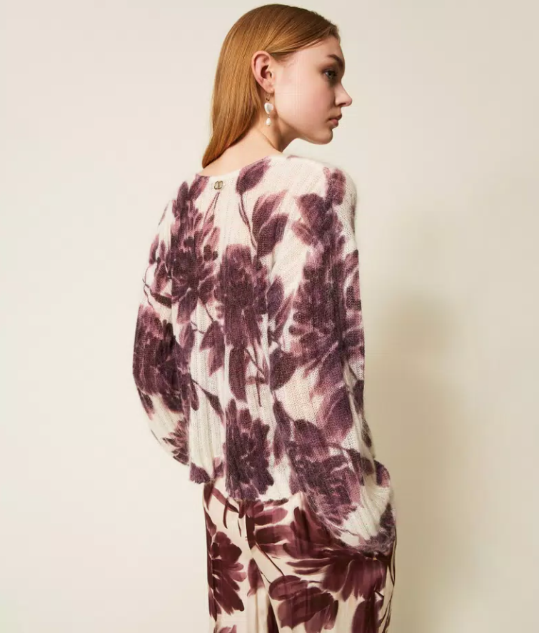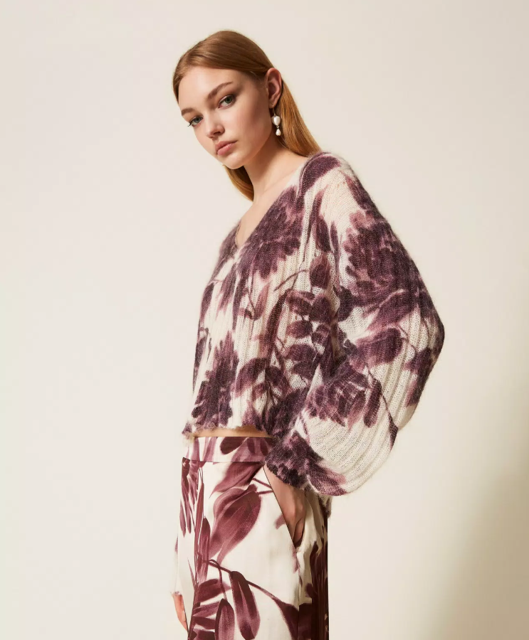Rib-knit jumper in a soft mohair blend featuring a dahlia flower print in Winetasting and Old White tones. Designed with a V-neck, long puff sleeves and a relaxed silhouette, it combines warmth and lightness for a modern yet poetic winter statement.