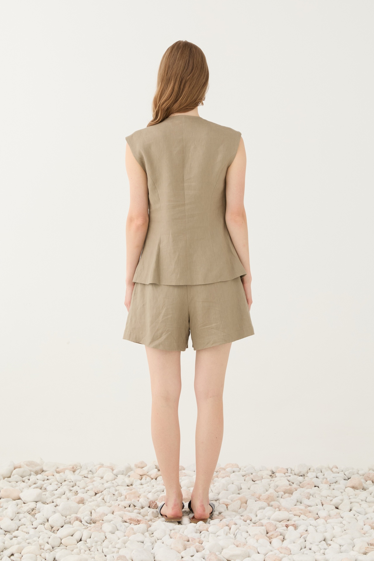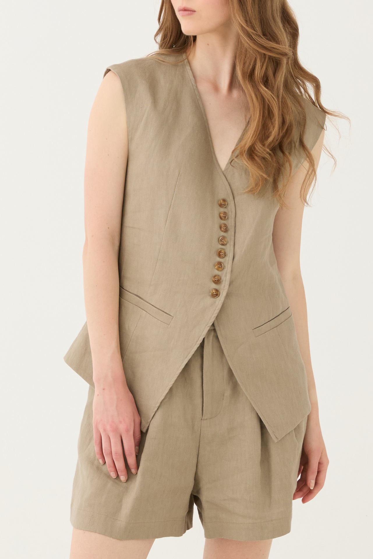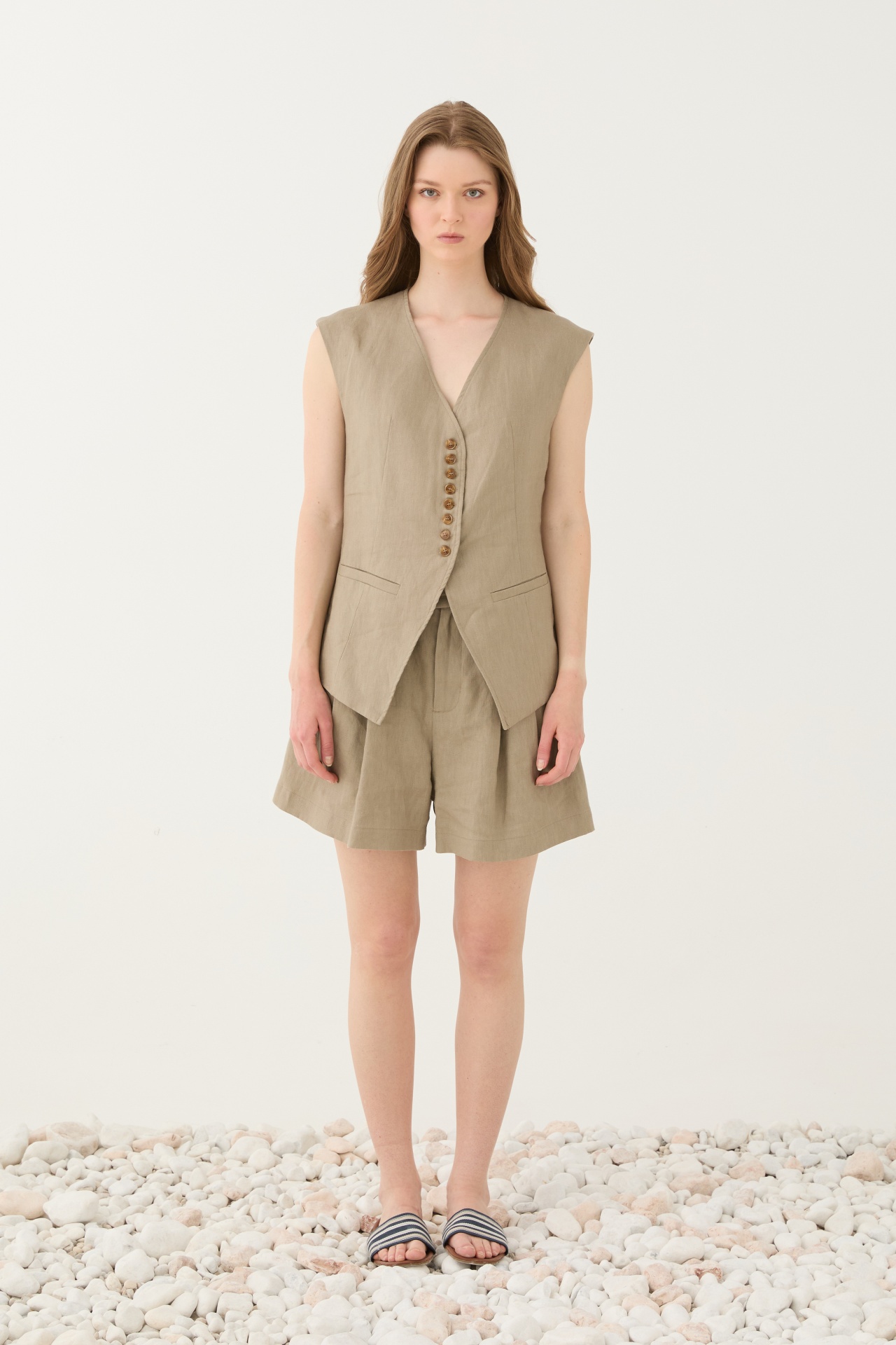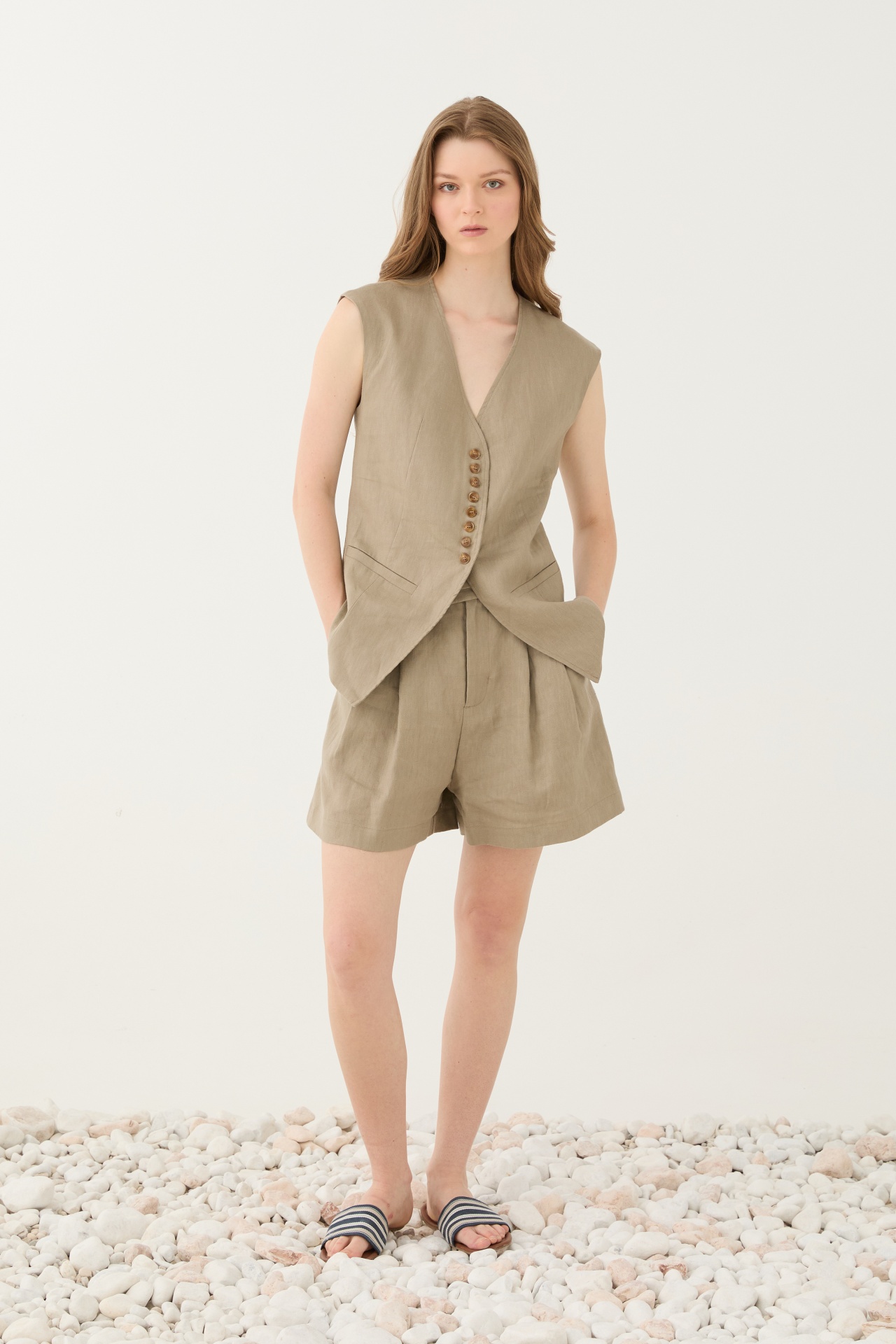 This 100% linen vest in mud grey blends lightweight tailoring with natural sophistication. The structured silhouette is softened by breathable fabric, while the V-neckline and front button closure add timeless elegance. Subtle front pockets reinforce its refined utilitarian touch, making it a versatile Spring/Summer 2026 essential.