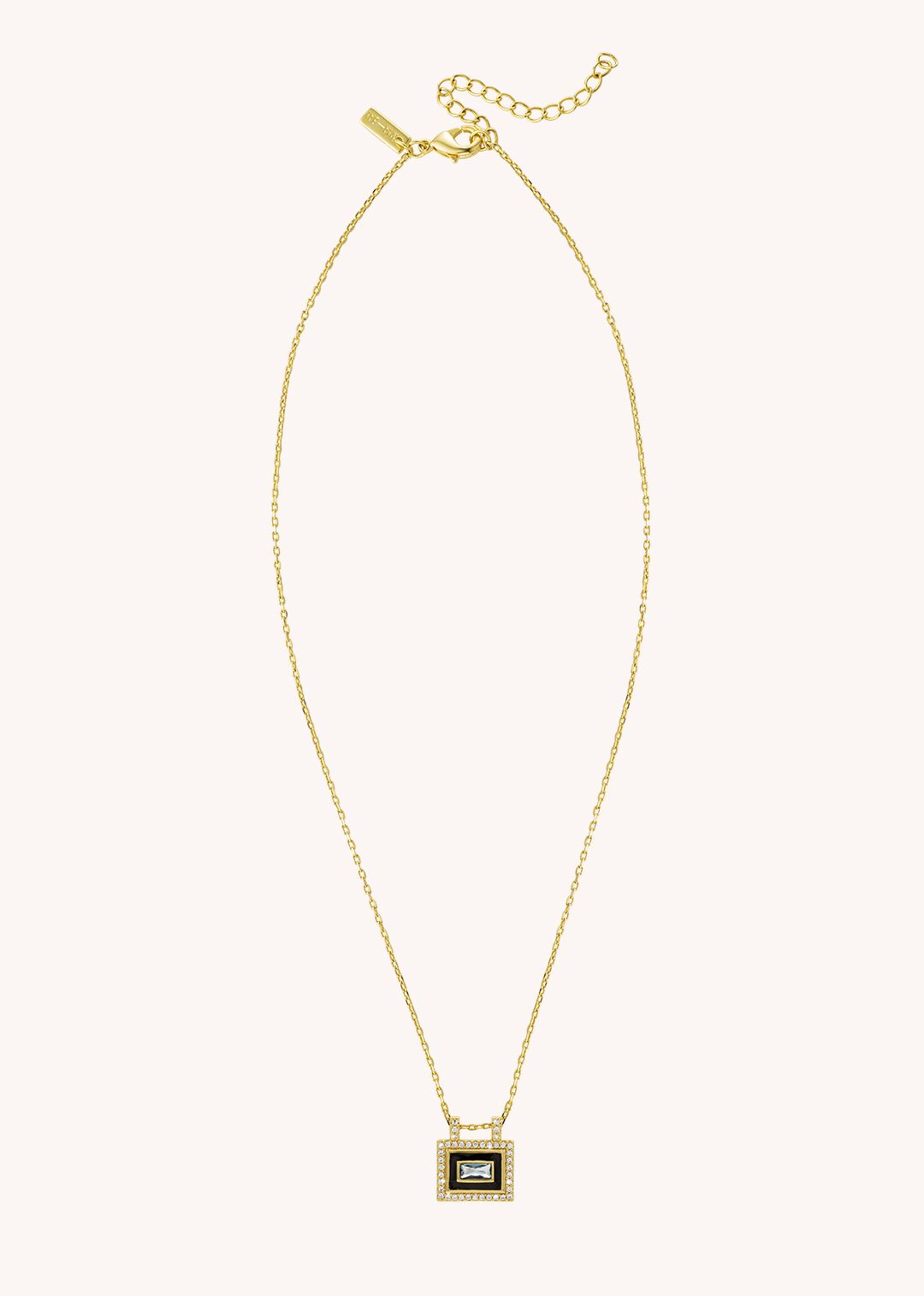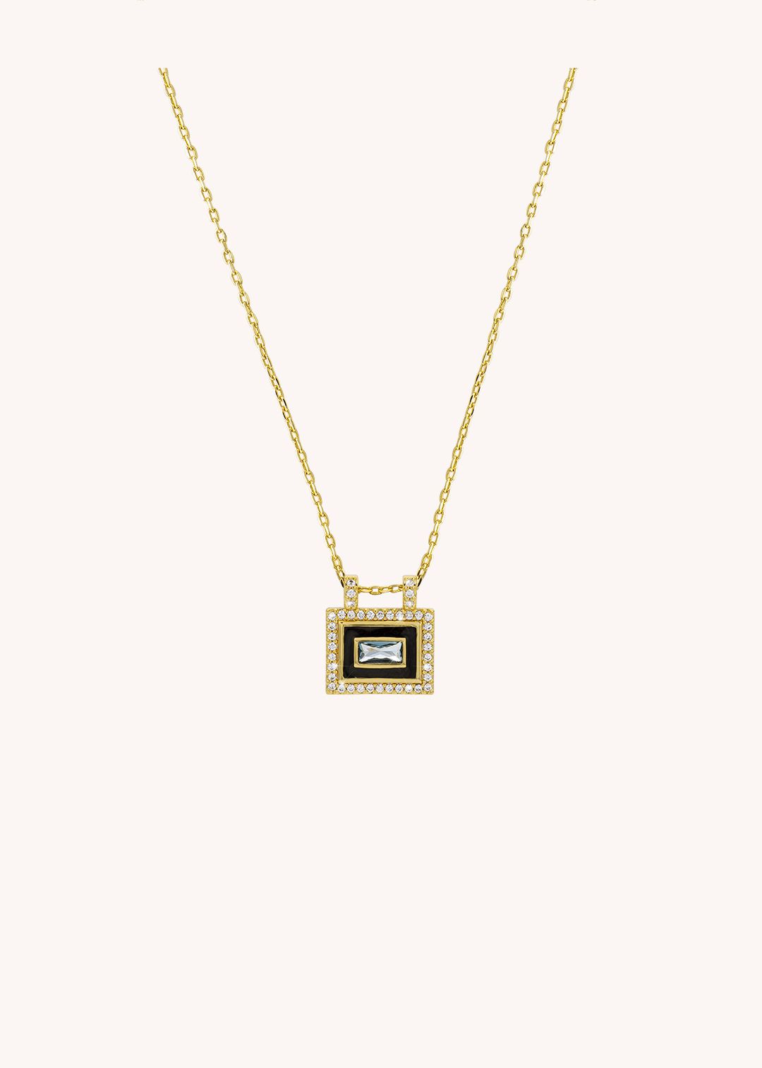 Its rectangular pendant, outlined in black enamel and sparkling stones, frames a luminous blue gem that catches the light with effortless elegance.