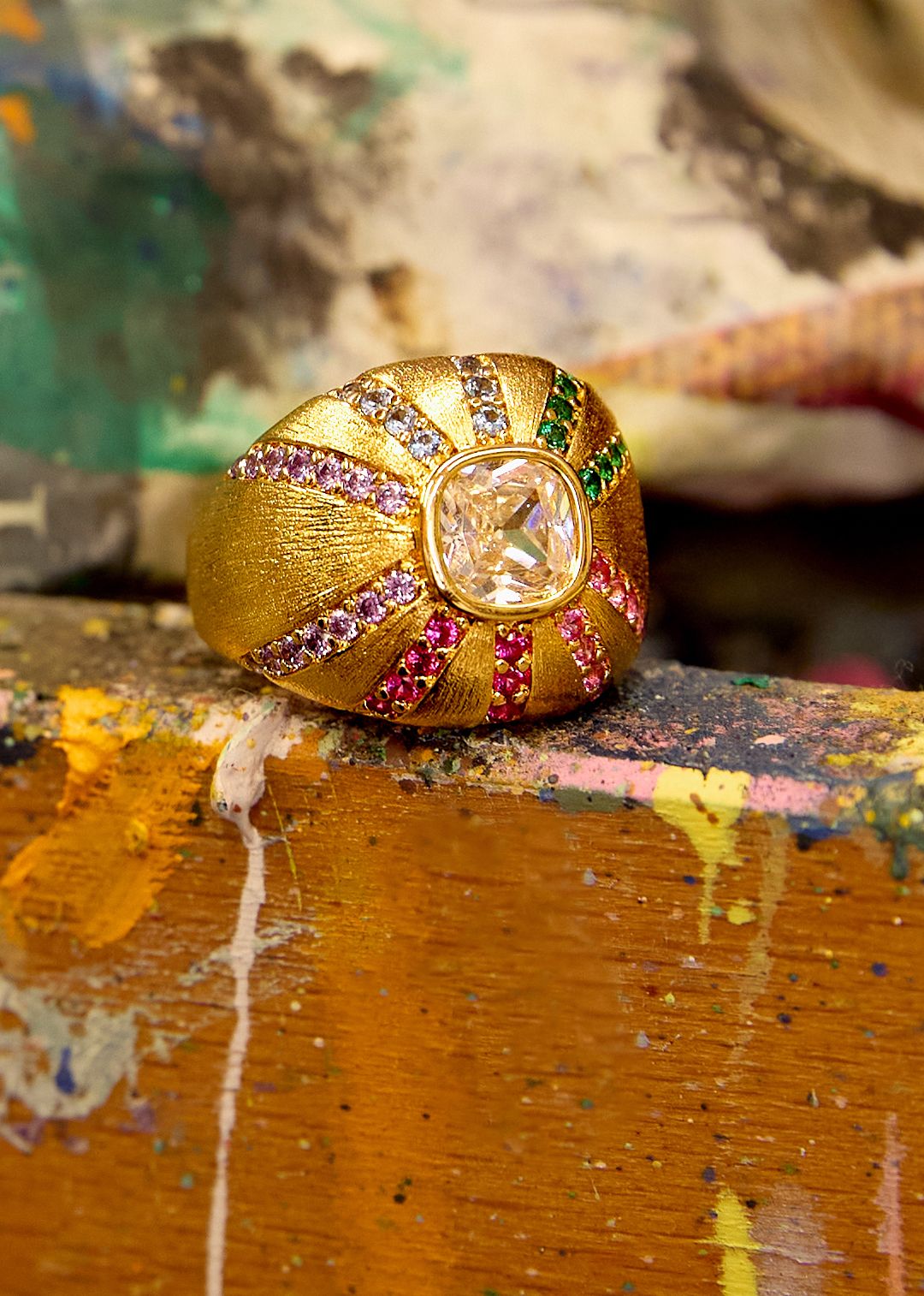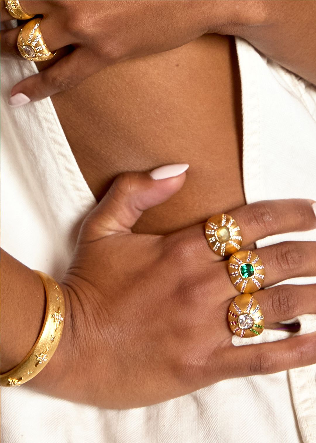 The Rainbow California ring by MYA BAY, gilded with 24-carat recycled fine gold, is a joyful statement piece that lights up any outfit.