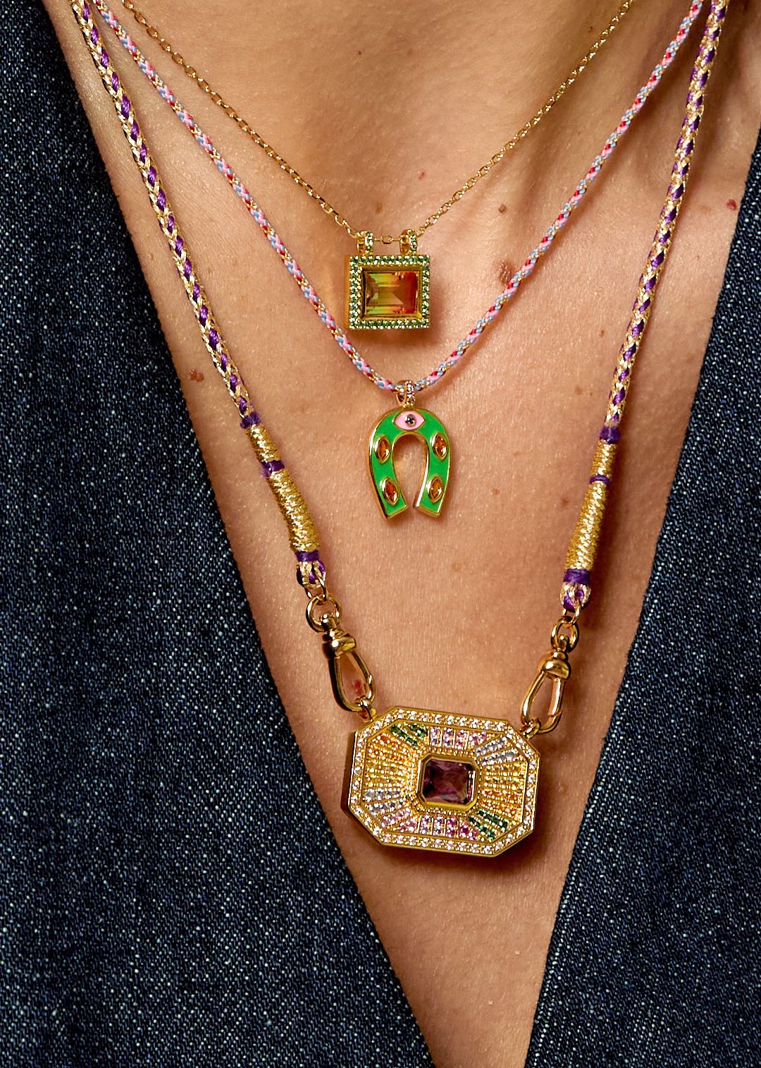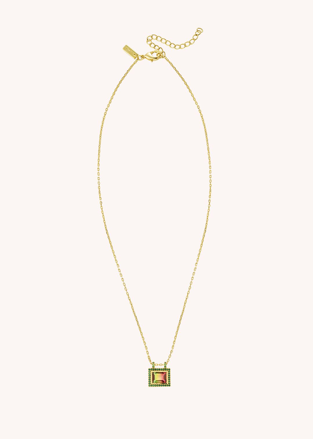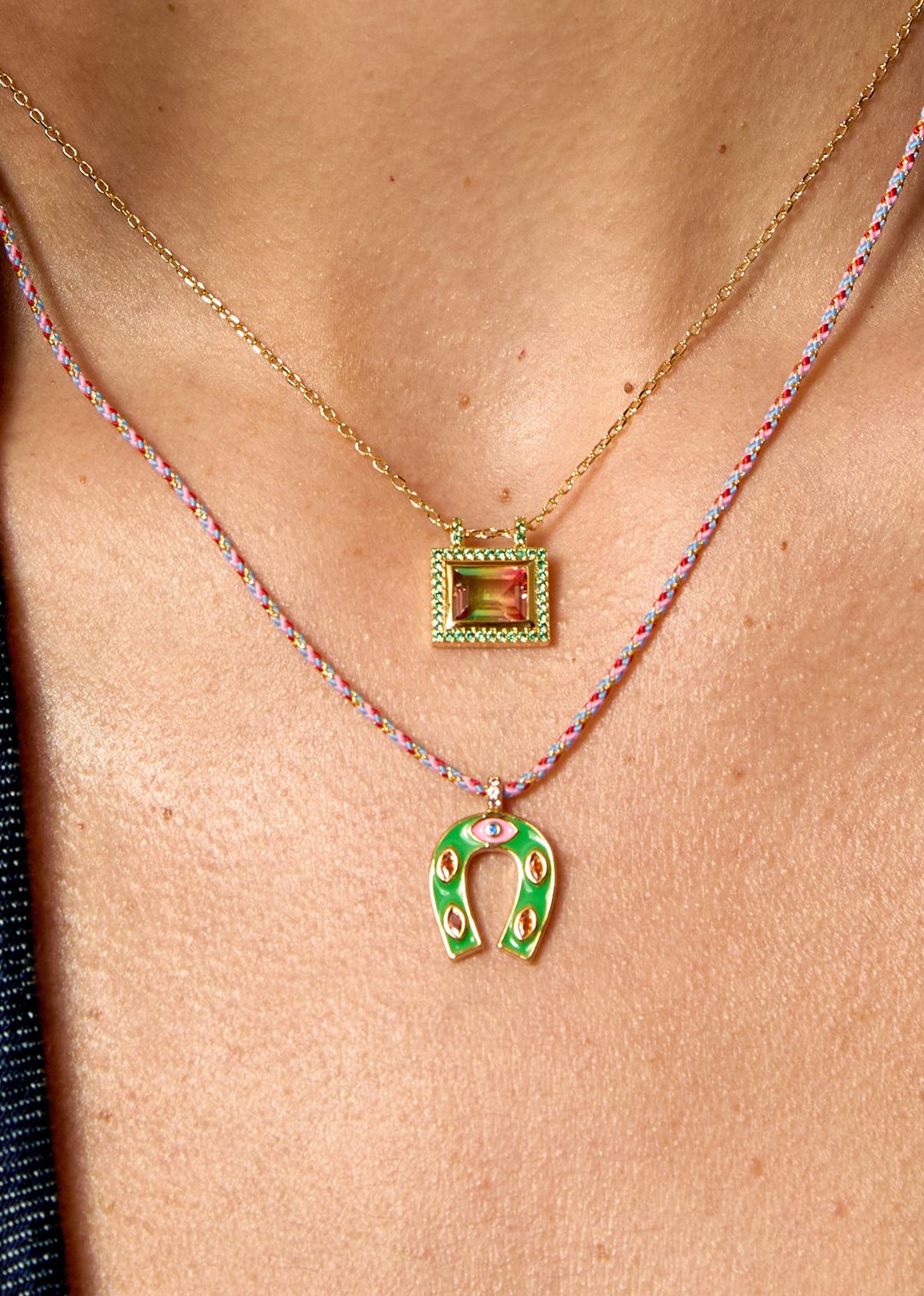 The Green Watermelon El Paso necklace by MYA BAY, gilded with 24-carat recycled fine gold, features green and watermelon-pink stones that create a luminous and refreshing contrast inspired by the vibrant hues of the Texan desert.