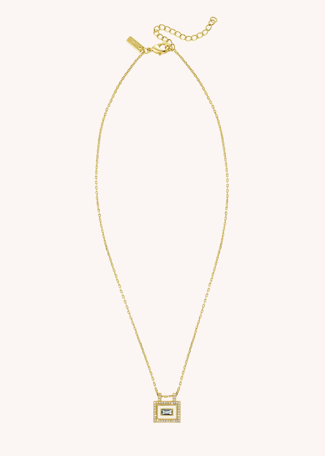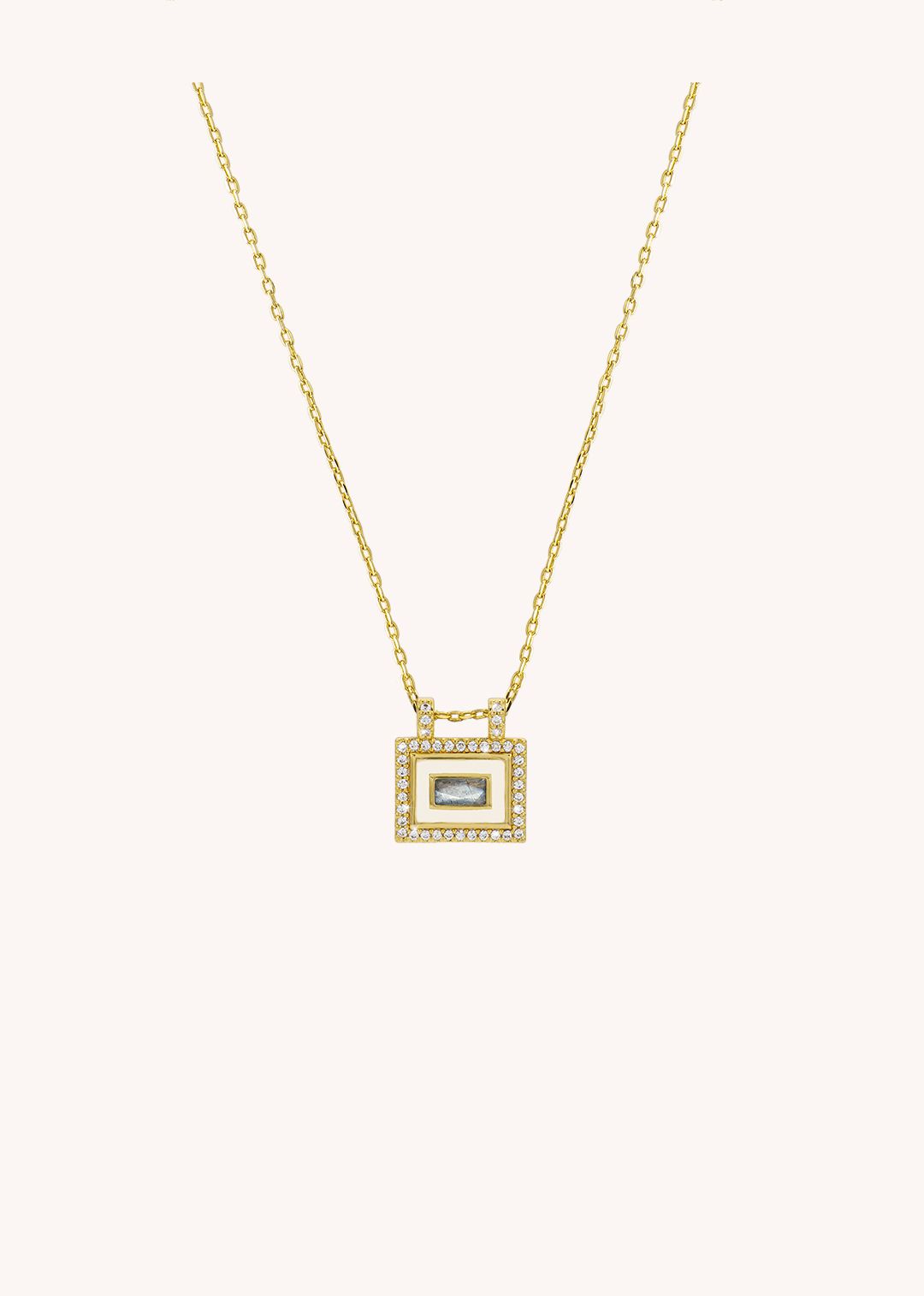 O pendente retangular, orlado por cristais e esmalte marfim, envolve uma labradorite de reflexos subtis e cambiantes, evocando a beleza do céu em movimento.