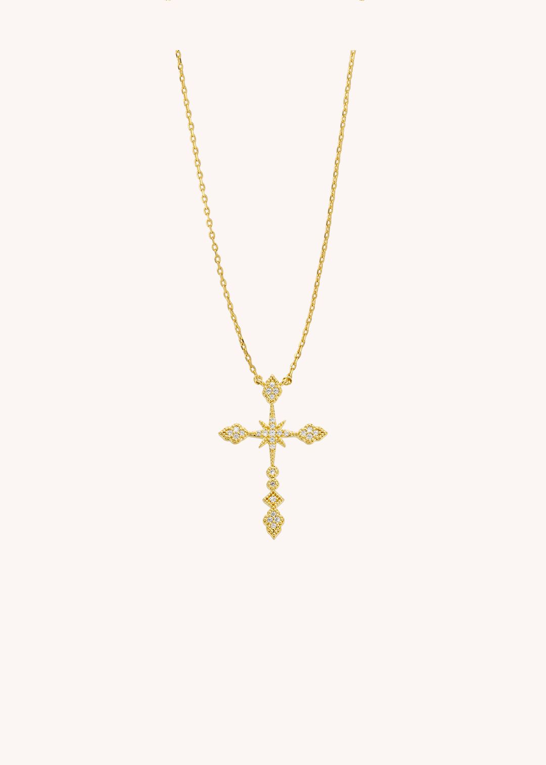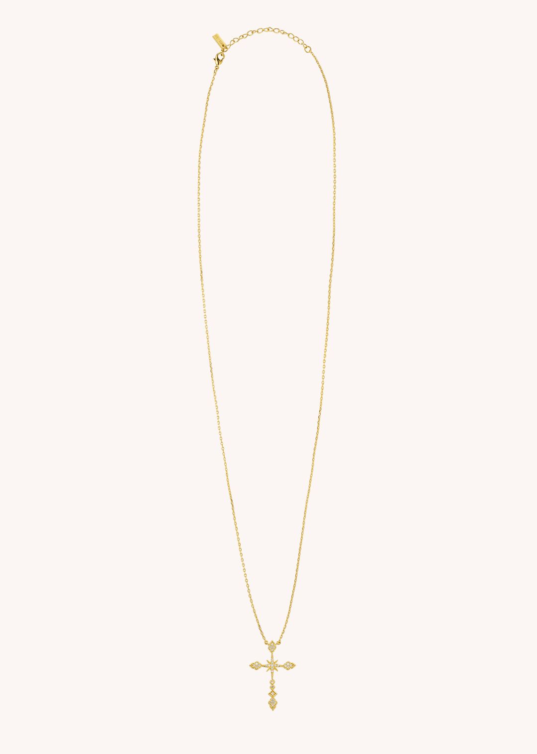 Com uma cruz imponente e linhas cheias de luz, é uma peça que combina espiritualidade e ousadia — feita para mulheres que não seguem regras, criam as suas.