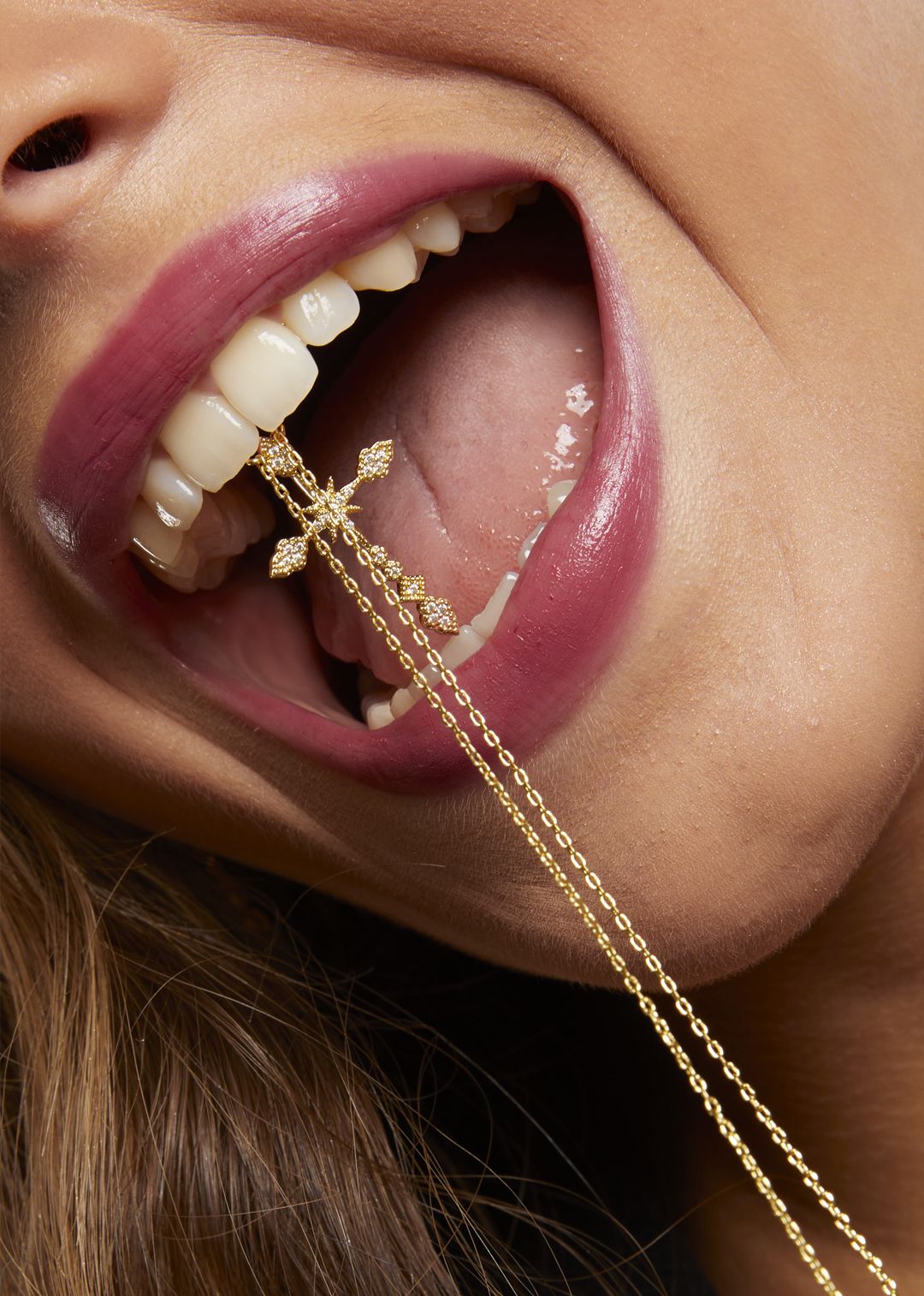 O brilho do ouro e o toque punk-chic do desenho fazem dele um amuleto moderno, perfeito para usar sozinho ou em layering com outros colares da marca.