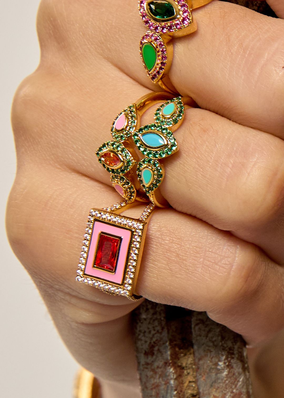 O anel Pink El Paso da MYA BAY, banhado a ouro fino reciclado de 24 quilates, combina suavidade e brilho num design geométrico marcante.