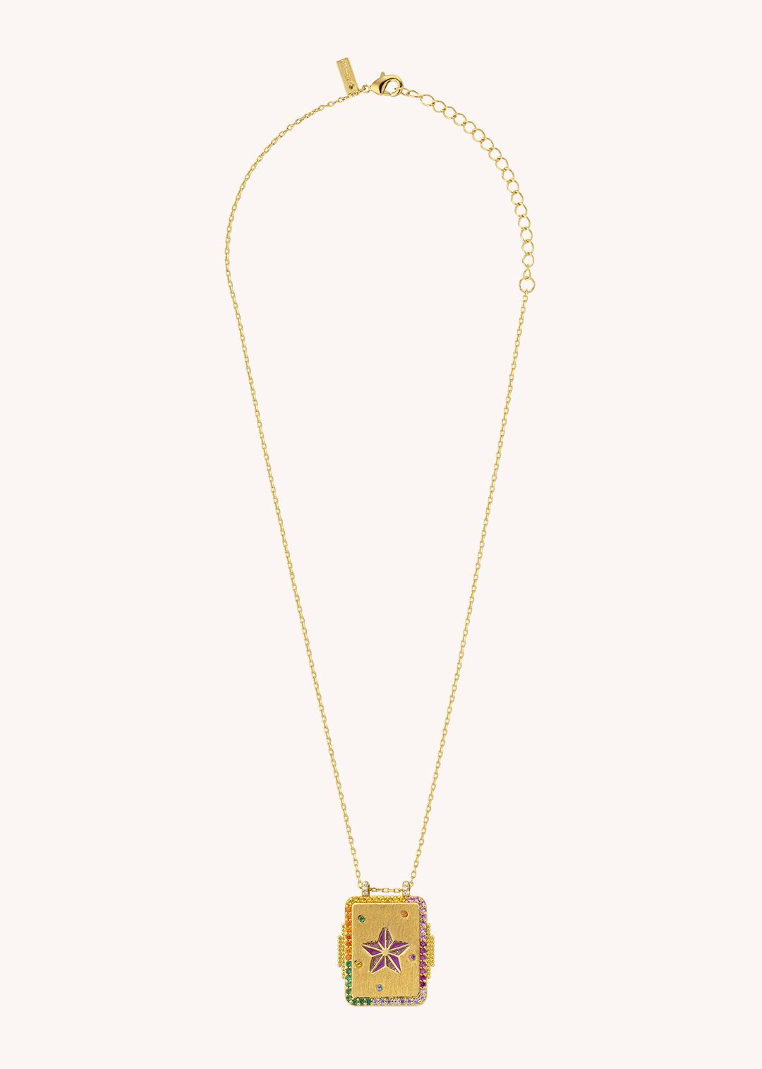 As pedras multicolores que contornam o design trazem uma vibração luminosa e positiva, transformando este colar num amuleto de liberdade e autoexpressão.