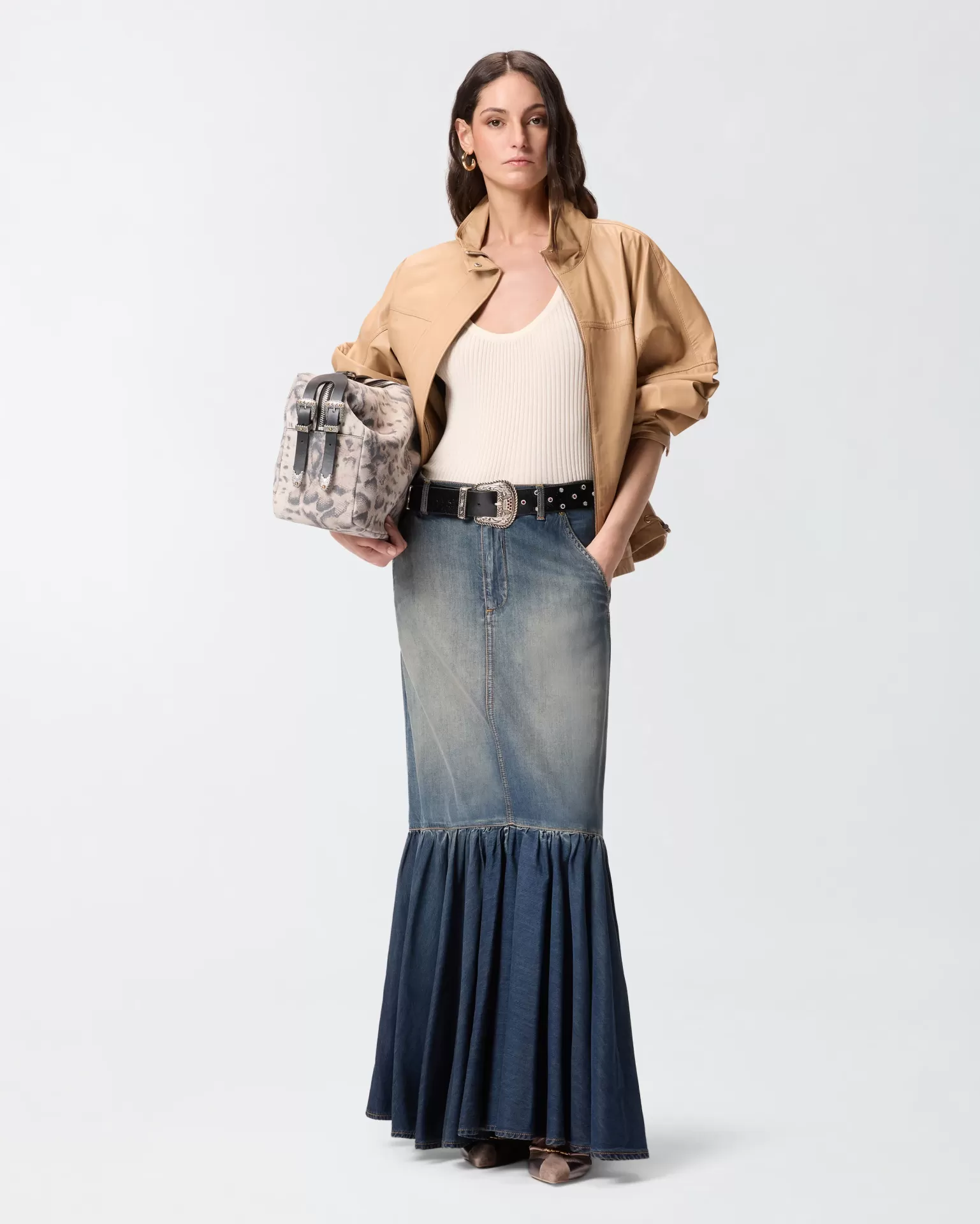 Com saia maxi em ganga (como na imagem) para uma silhueta moderna e cool