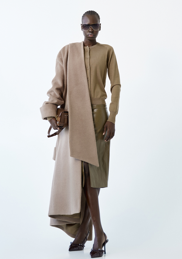 O regresso dos tons naturais e dos acabamentos em pele eco marcam a estação, traduzindo uma estética refinada e consciente. A saia midi em verde oliva insere-se na tendência Quiet Luxury, apostando em texturas ricas e silhuetas puras.