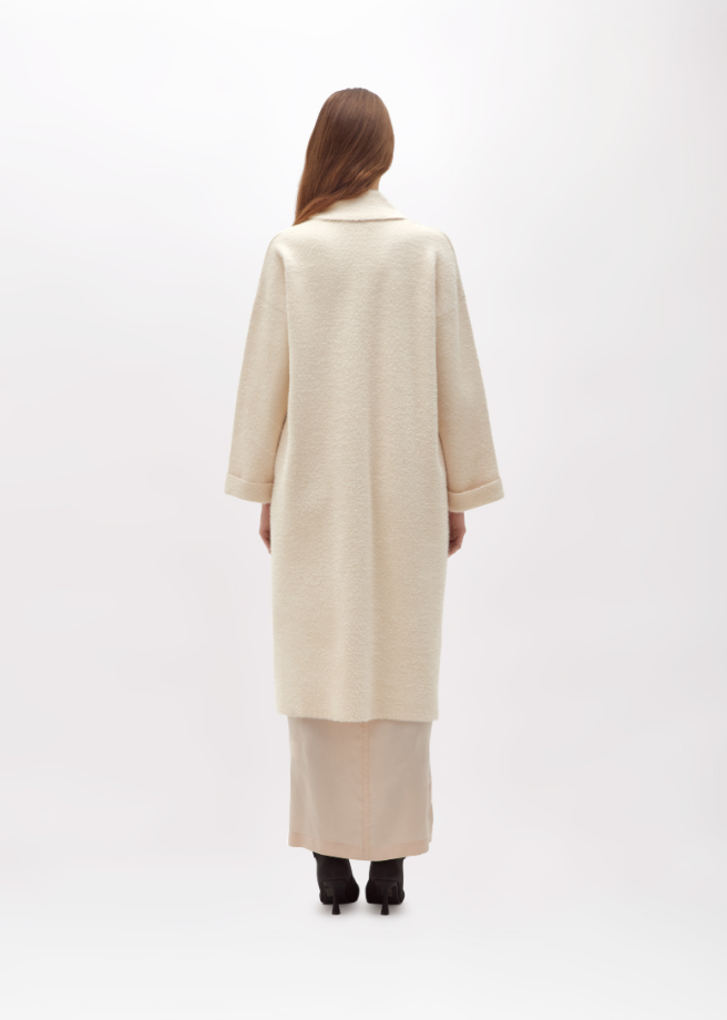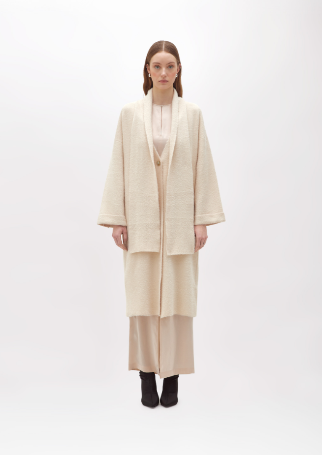 Sofisticado, dramático e incrivelmente confortável, este cardigan oversized em efeito de pelo é uma peça statement que conjuga elegância e aconchego. O seu design destaca-se pela gola de lenço integrada, decote em V e fecho com botão joia — um detalhe que acrescenta um toque luxuoso. As mangas largas com punho e o acabamento em viscose contrastante elevam o visual, conferindo fluidez e estrutura à peça.