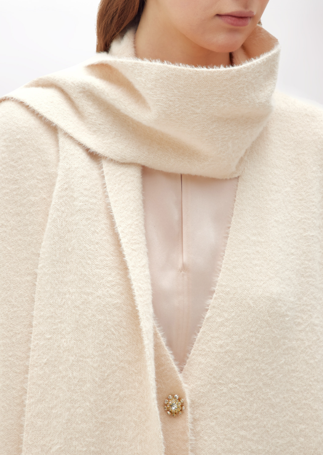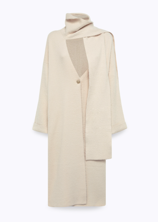 Sophisticated, dramatic, and effortlessly comfortable, this oversized cardigan in a soft fur-effect knit is a statement piece that combines warmth and refined elegance. Designed with an integrated scarf collar, V-neckline, jewel button fastening, and wide long sleeves with turned cuffs, it’s finished with contrasting viscose edging for a polished touch.