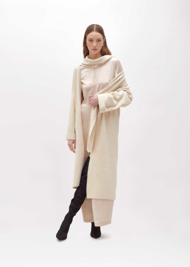 Layer it over a satin dress or wide-leg trousers for an understated, sophisticated look. For a modern edge, pair with structured leather ankle boots or sleek heeled boots.