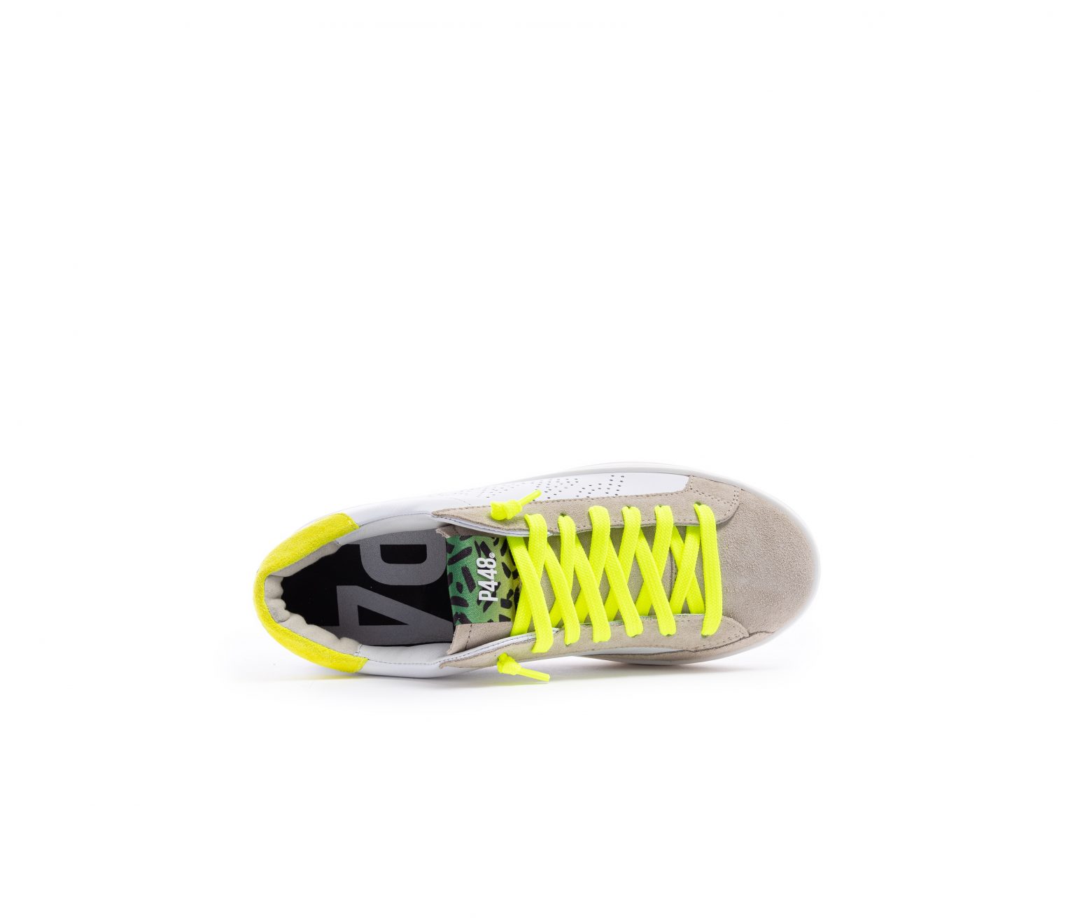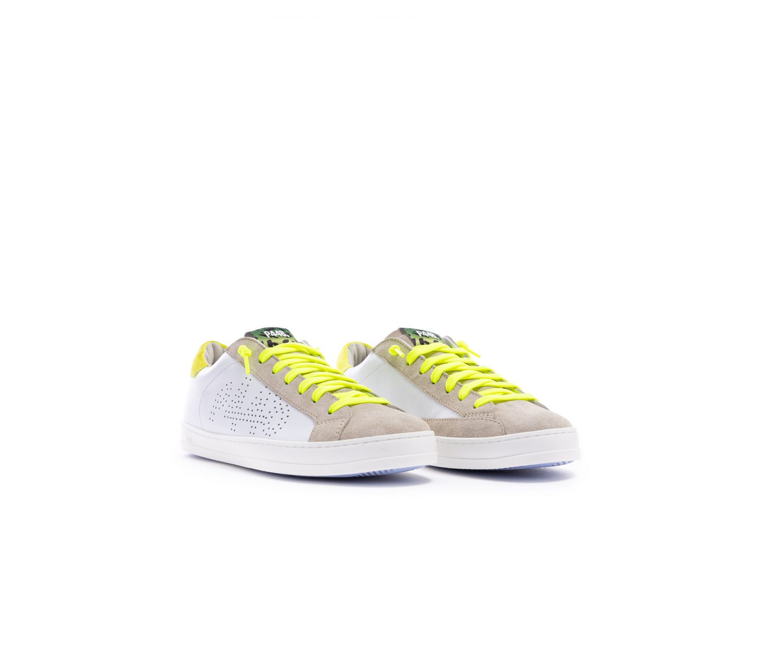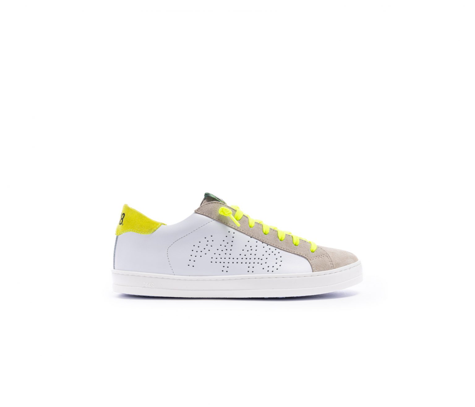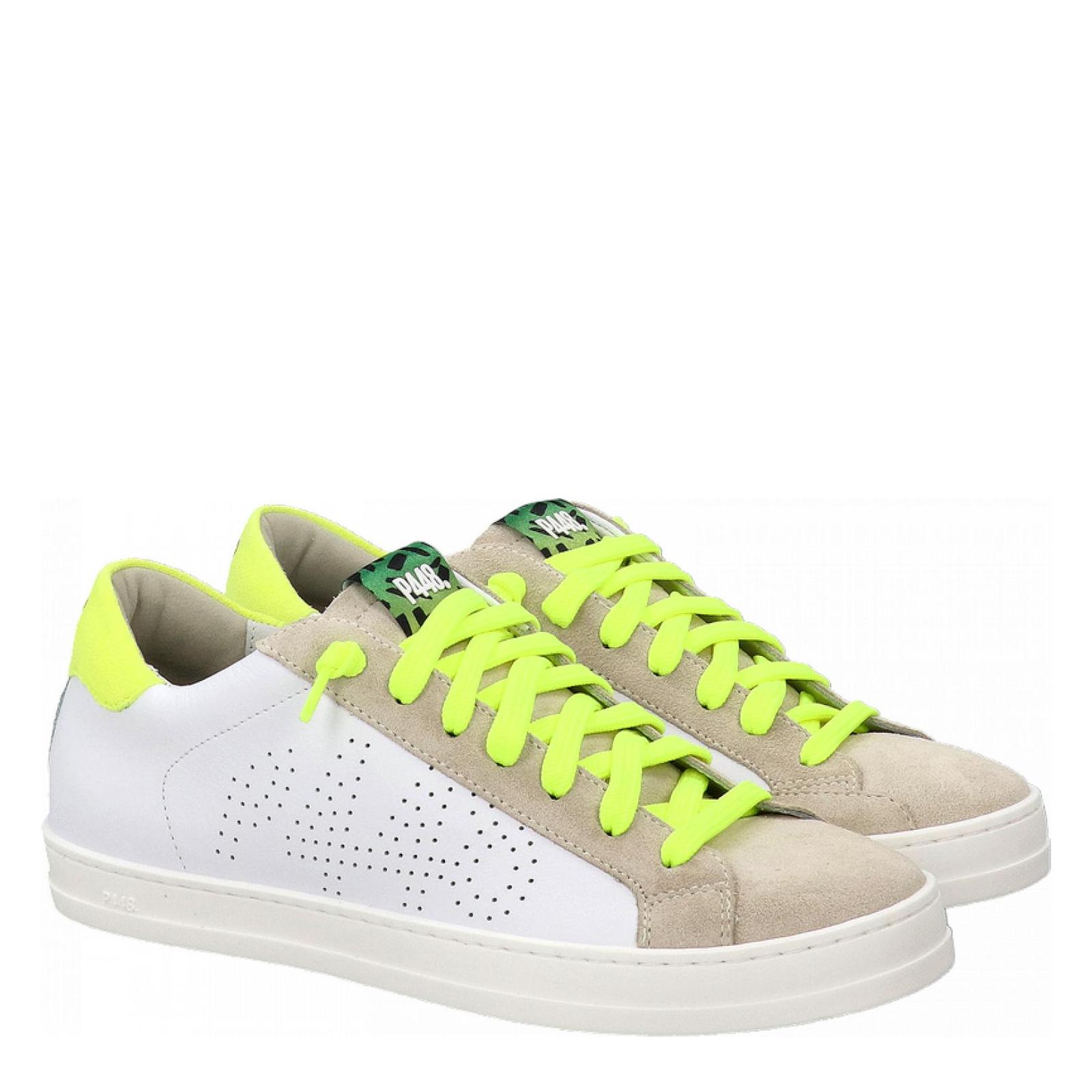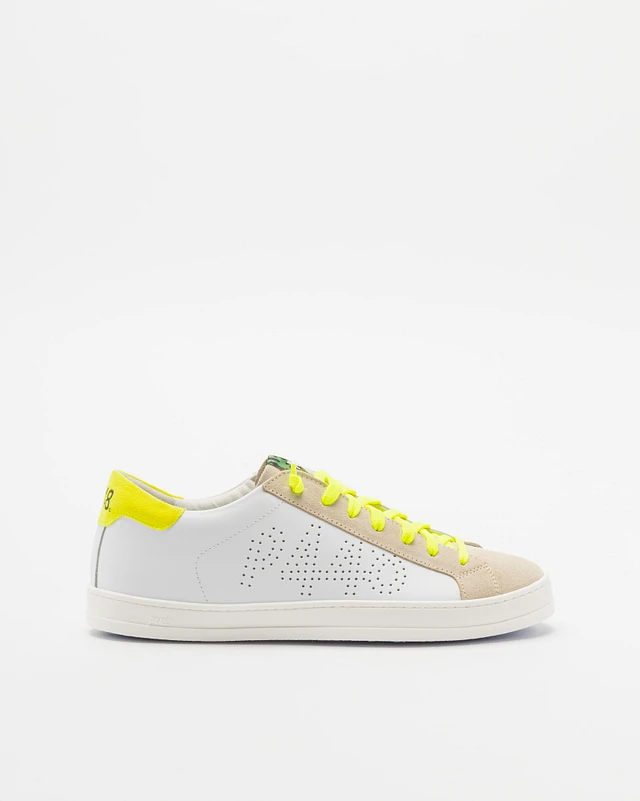 The P448 John M White Sand sneakers reinterpret a timeless urban classic with a bold, contemporary twist, perfectly in tune with the FW25/26 trends where neon accents and contrast details take centre stage. Crafted from premium white leather with beige suede overlays, they stand out thanks to the vibrant neon-yellow laces and matching heel tab, adding an energetic edge. The perforated P448 logo on the side provides a subtle graphic signature, while the durable rubber sole ensures comfort and everyday wearability. Effortlessly versatile yet statement-making, these sneakers inject urban cool and modern energy into any casual wardrobe.