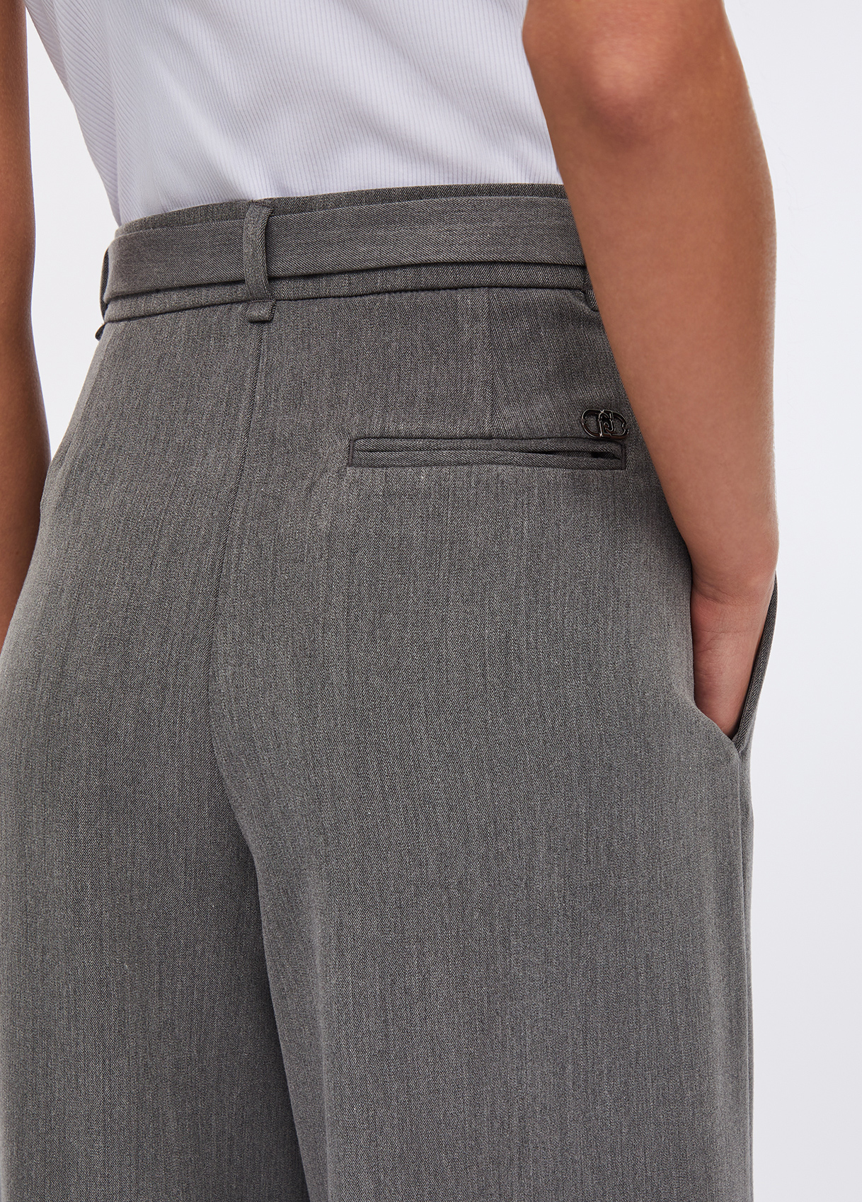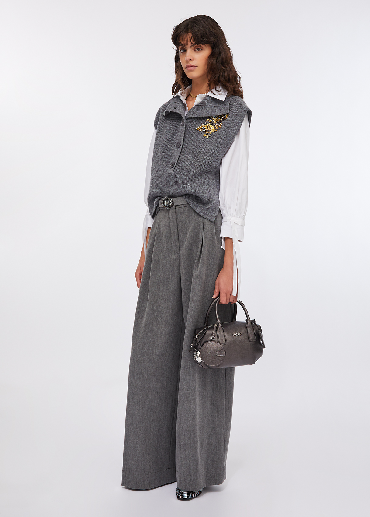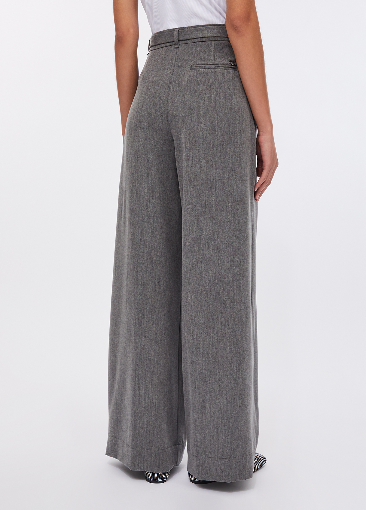 High-tech stretch palazzo trousers crafted from viscose-blend yarns for comfort and structure. Featuring front darts, side pockets, welt back pockets, and a removable belt with a jewel-embellished buckle.